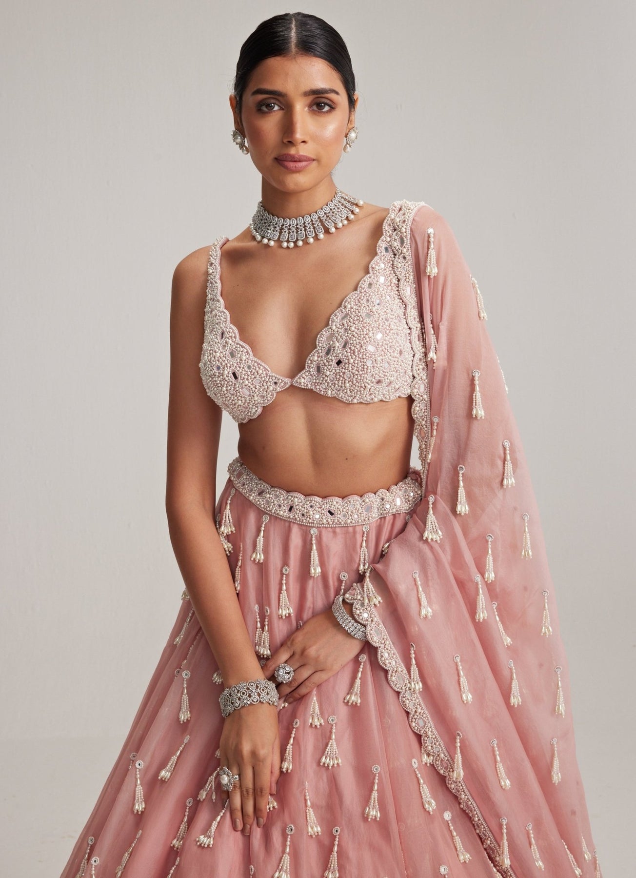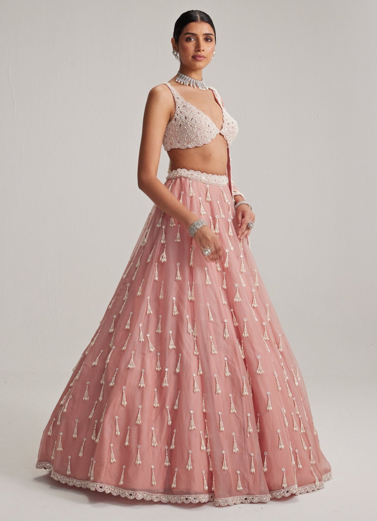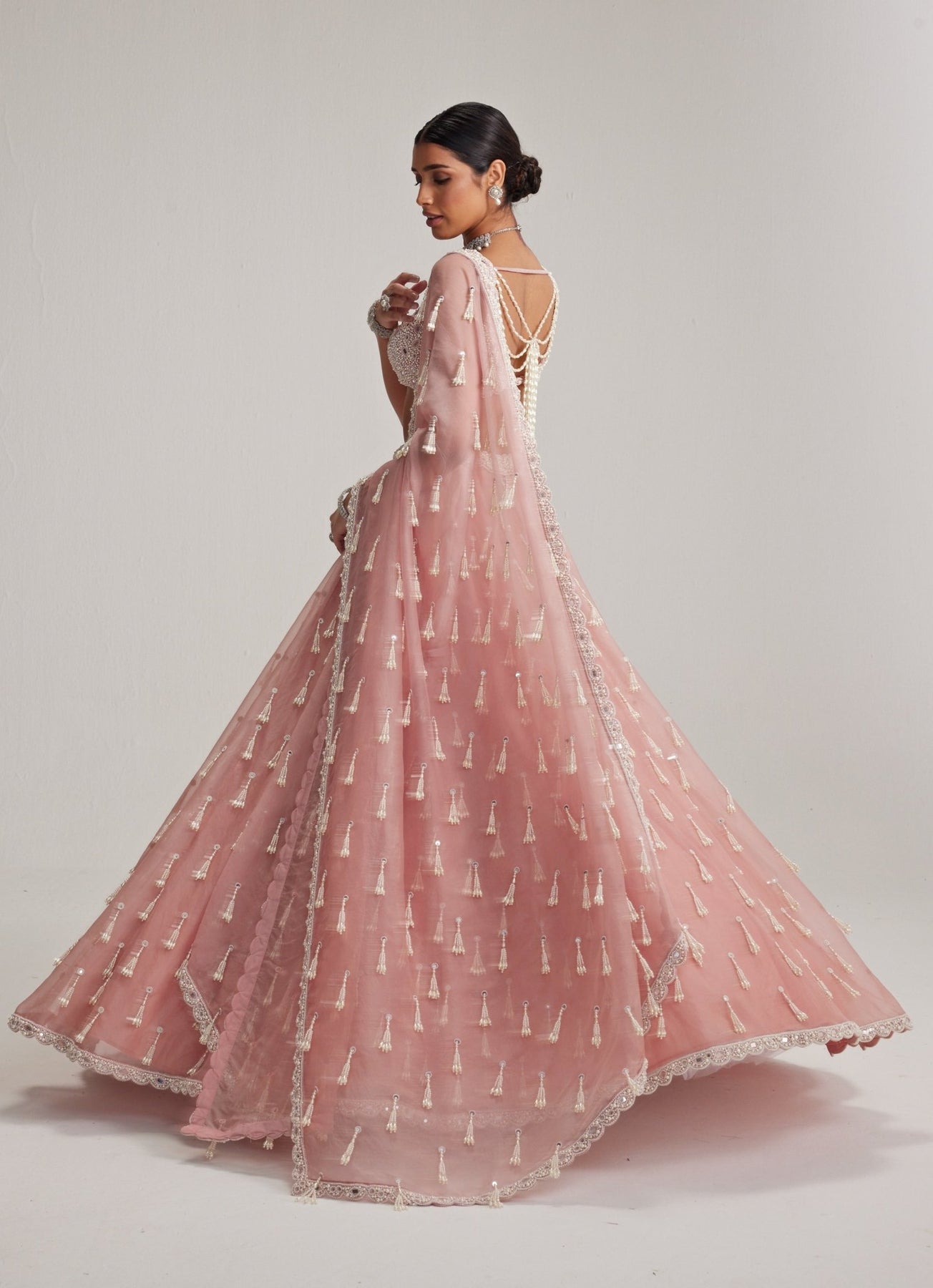 Dusty Rose Pearl Tasseled Organza Lehenga Set