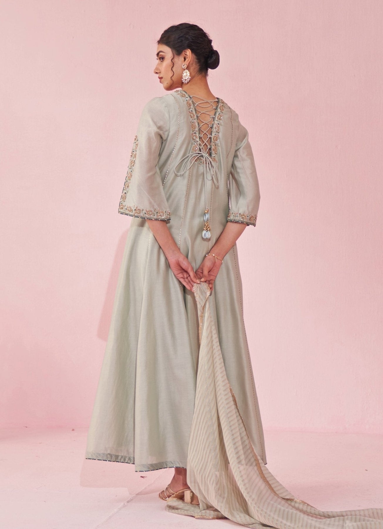 Ice Blue Chanderi Silk Embroidered Anarkali Pants Set