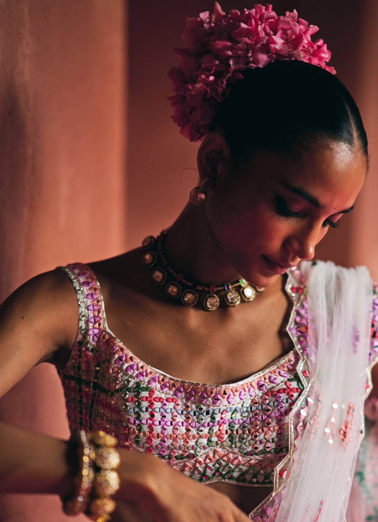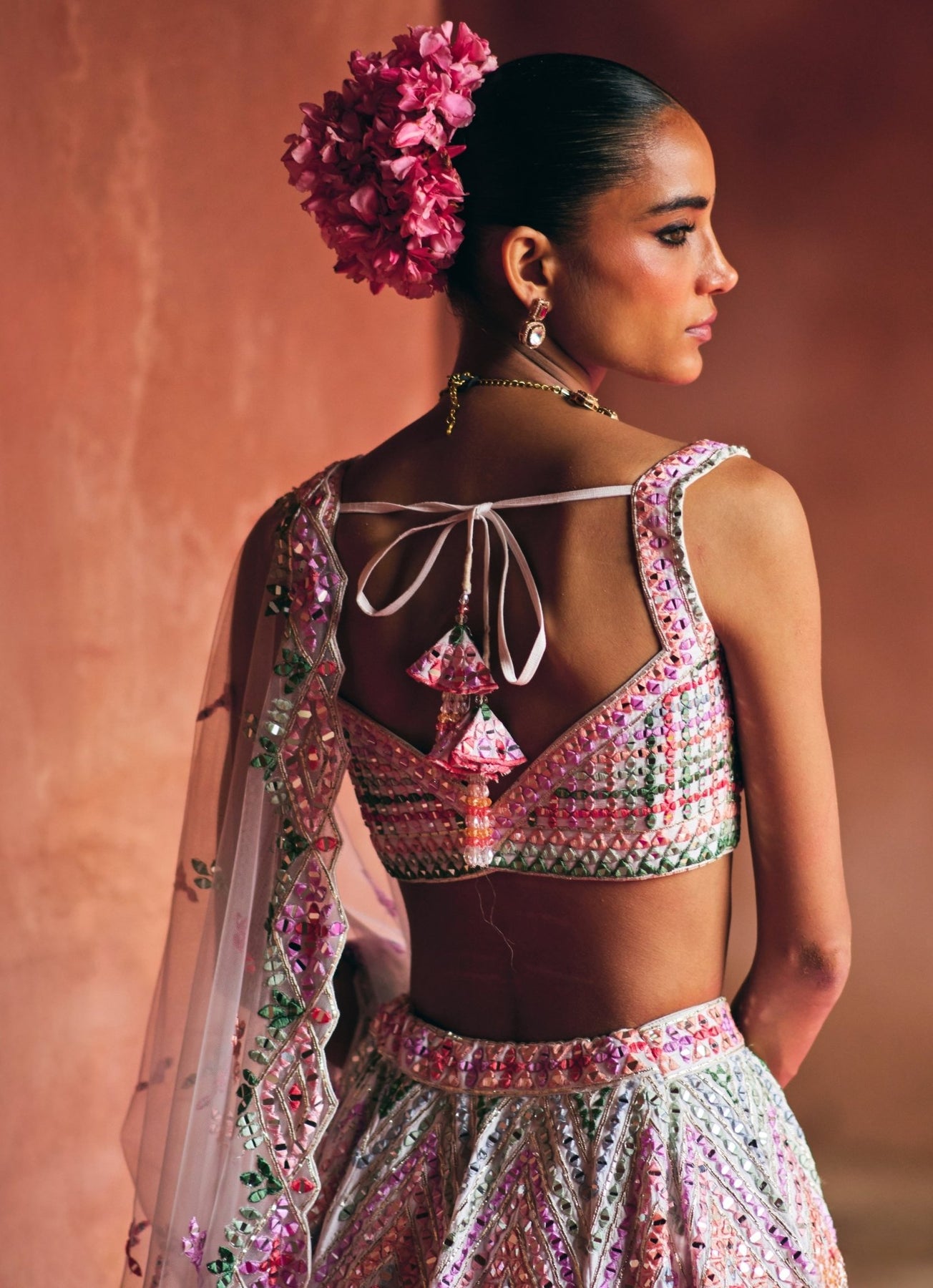 Glow with anticipation and style in this Ivory Silk Lehenga, an artistic treasure for pre-wedding charm. The raw silk skirt glimmers with chevron and floral mirror embroidery, enriched with multicolor threadwork, zari, and delicate gota highlights. A coordinating blouse and soft net dupatta harmonize seamlessly, completing a refined look infused with intricate artistry and timeless grace.