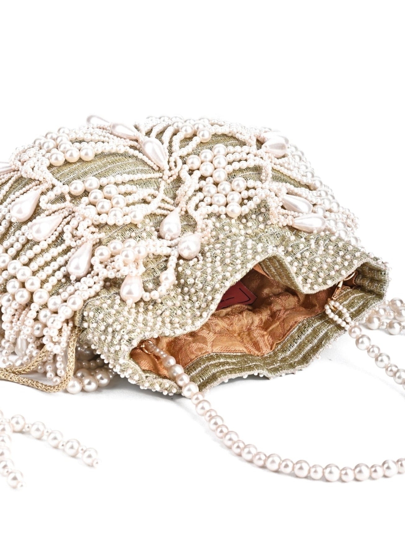 Hand-crafted with pearls, delicate handmade pearl tassels at the bottom and a pearl-beaded handle. Crafted from high-quality materials for durability and repeated use. This collectable potli fits valuables like a smartphone, makeup, keys, currency and cards.