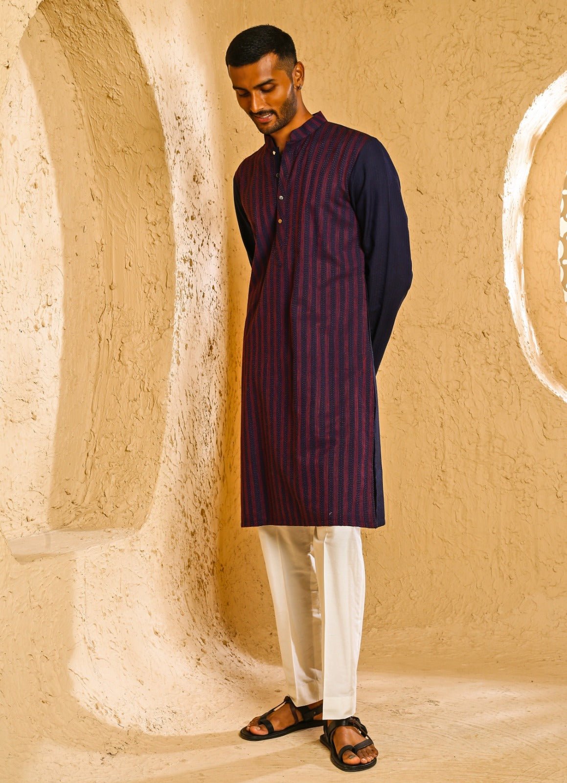Refined elegance meets contemporary ease in this Navy Blue Kurta Pants Set designed to elevate intimate celebrations. The smooth cotton-silk ivory pyjama pants offer a lightweight feel and effortless movement, creating a polished foundation for the look. Paired with a navy kurta featuring subtle maroon thread lines, this kurta set brings together richness, texture, and modern refinement ideal for special moments.