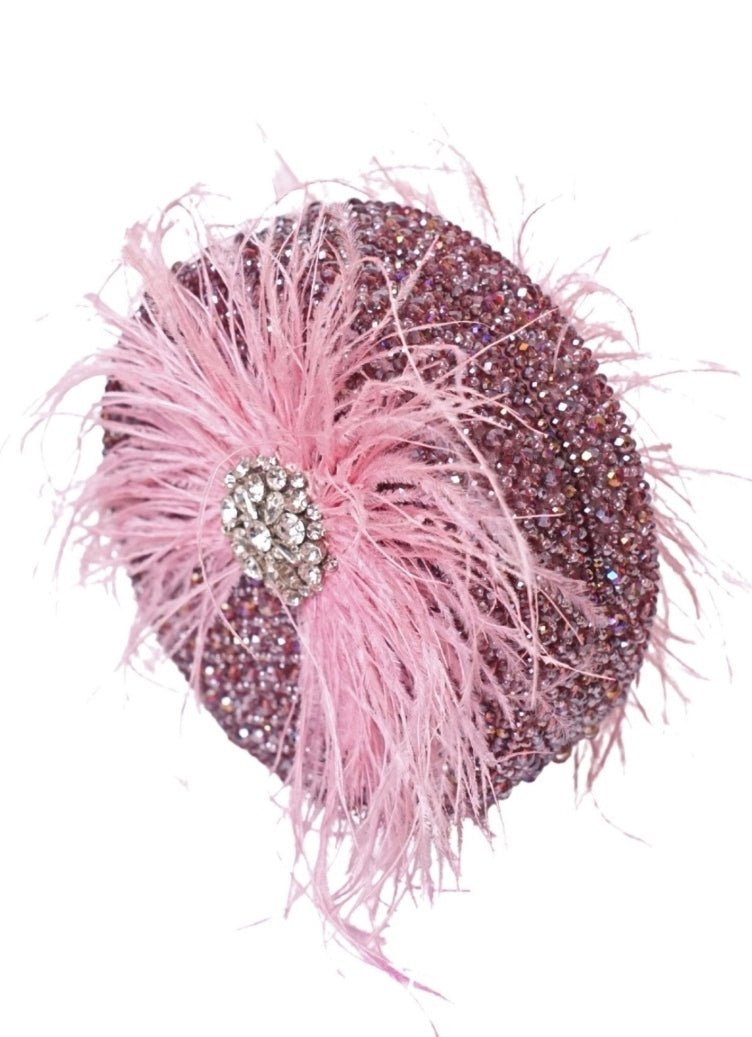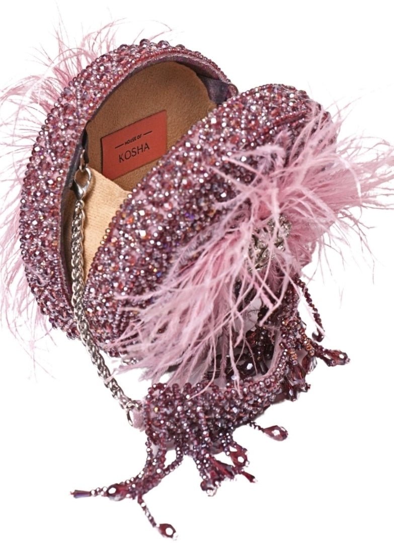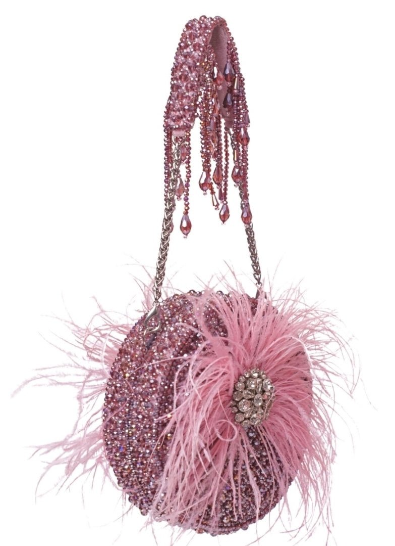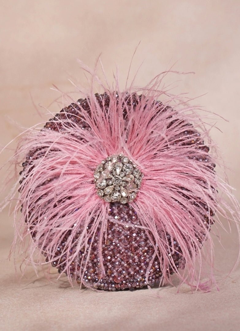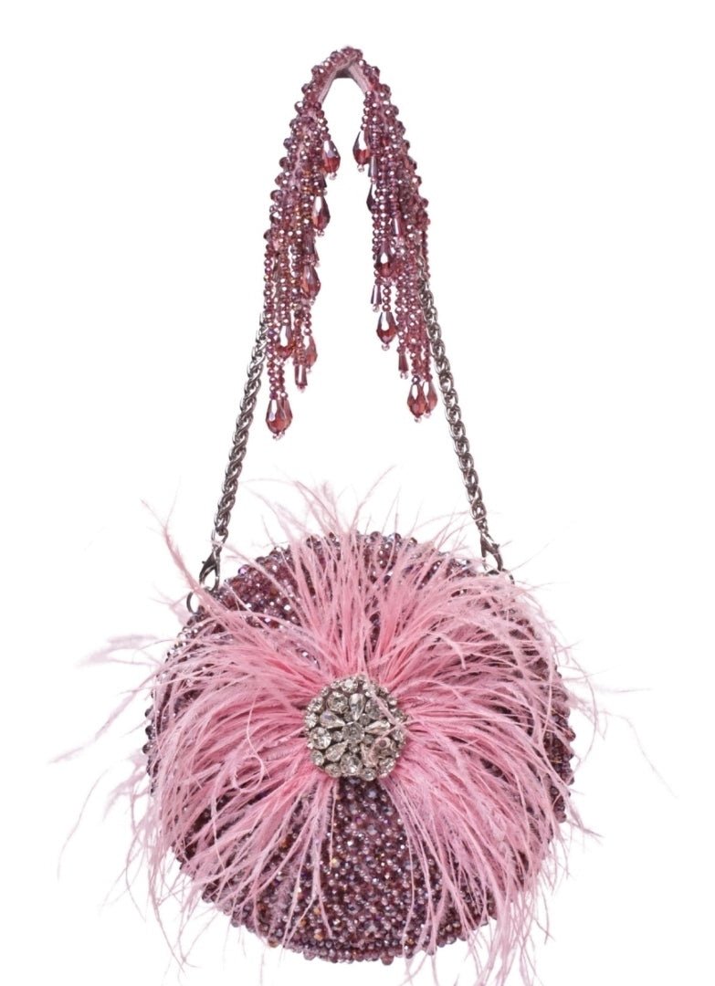 Adorned with feathers and a beautiful brooch on both sides, hand-crafted with mauve feathers and a crystal base. It features a detachable hand-embroidered crystal chain for added charm. Designed with a magnetic flap closure for ease and elegance.