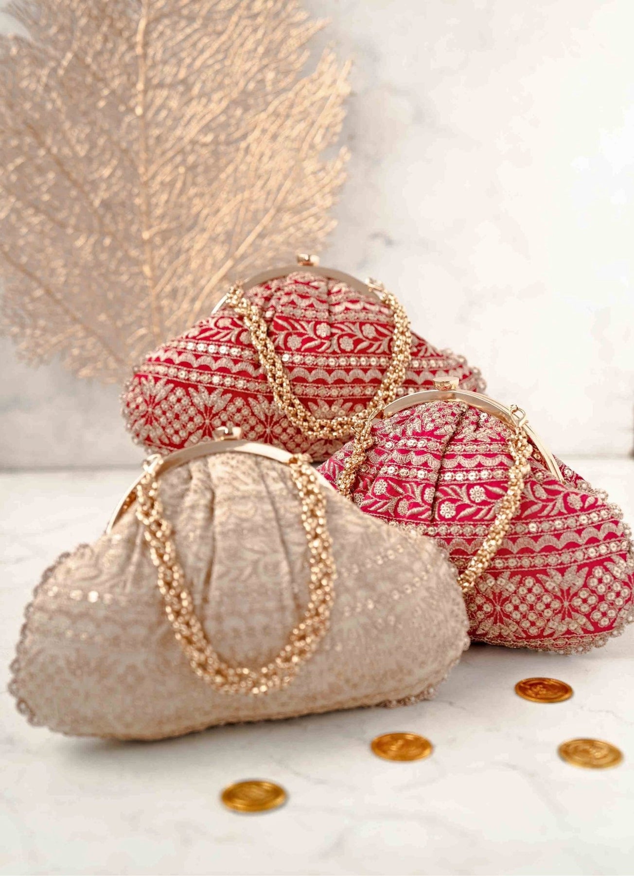This pink embroidered vintage purse delivers a graceful festive charm with its delicate gold threadwork and shimmering scalloped lace. Tassels add movement and richness, completing its elegant silhouette. A refined accessory for the bride who seeks effortless opulence.