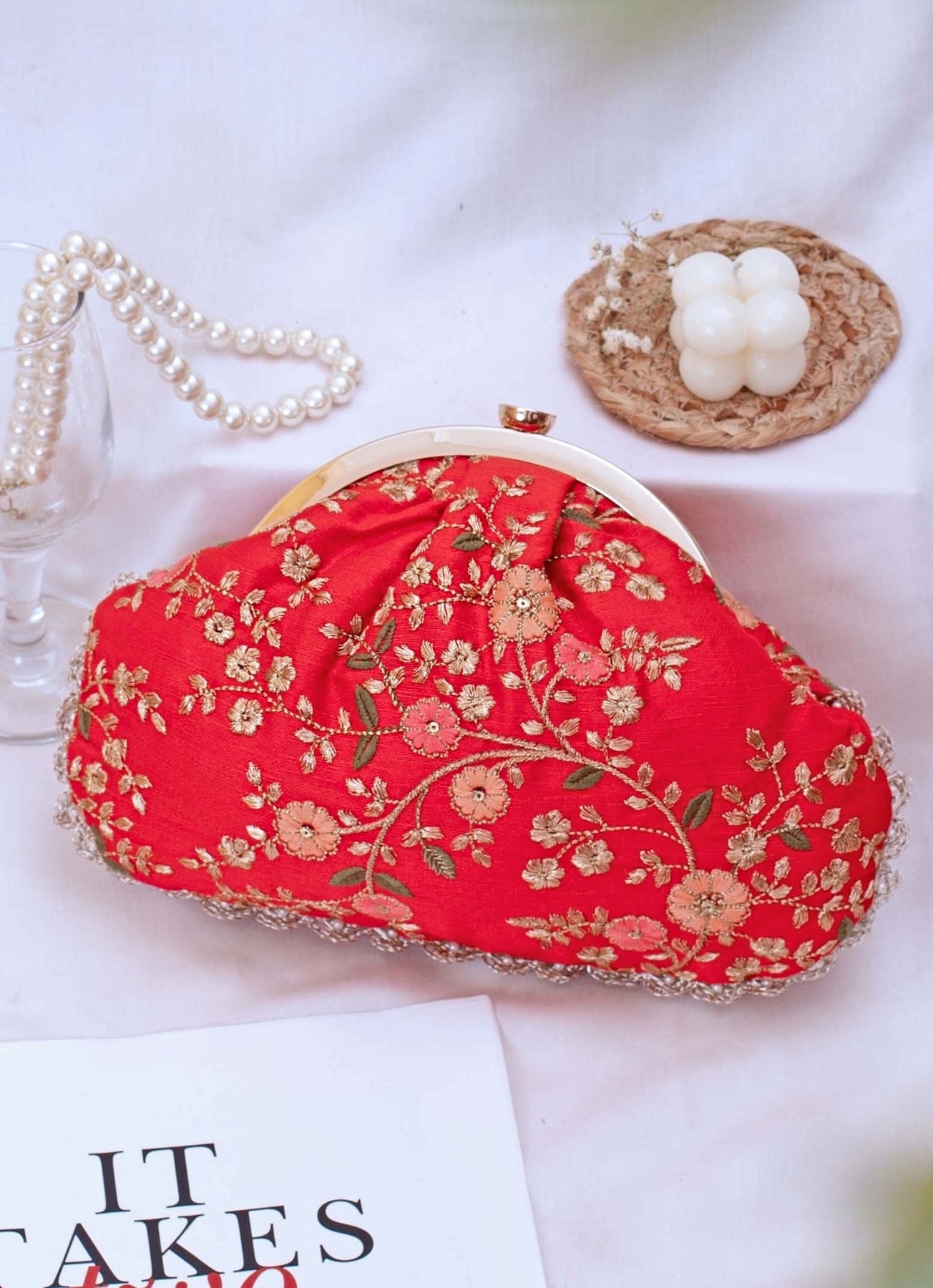 Adorned with beautiful pastel floral embroidery, this red vintage purse is handcrafted with exquisite detail, blending bold colour with delicate artistry. The intricate motifs create a striking statement, making it ideal for festive and traditional occasions. A timeless piece with rich cultural appeal. Perfect Red Vintage purse for your Kurta Sharara Set.