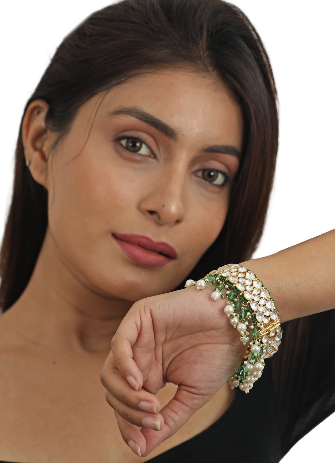 Evoking regal sophistication and intricate artistry, this beautiful bangle is a timeless statement of luxury. Encrusted with radiant white Jadtar stones bordered by vivid green beads and delicate pearls, it captures the perfect harmony of opulence and tradition. The gold-toned base enhances its brilliance, making it a versatile adornment for festive or bridal occasions. A polished statement for a saree.