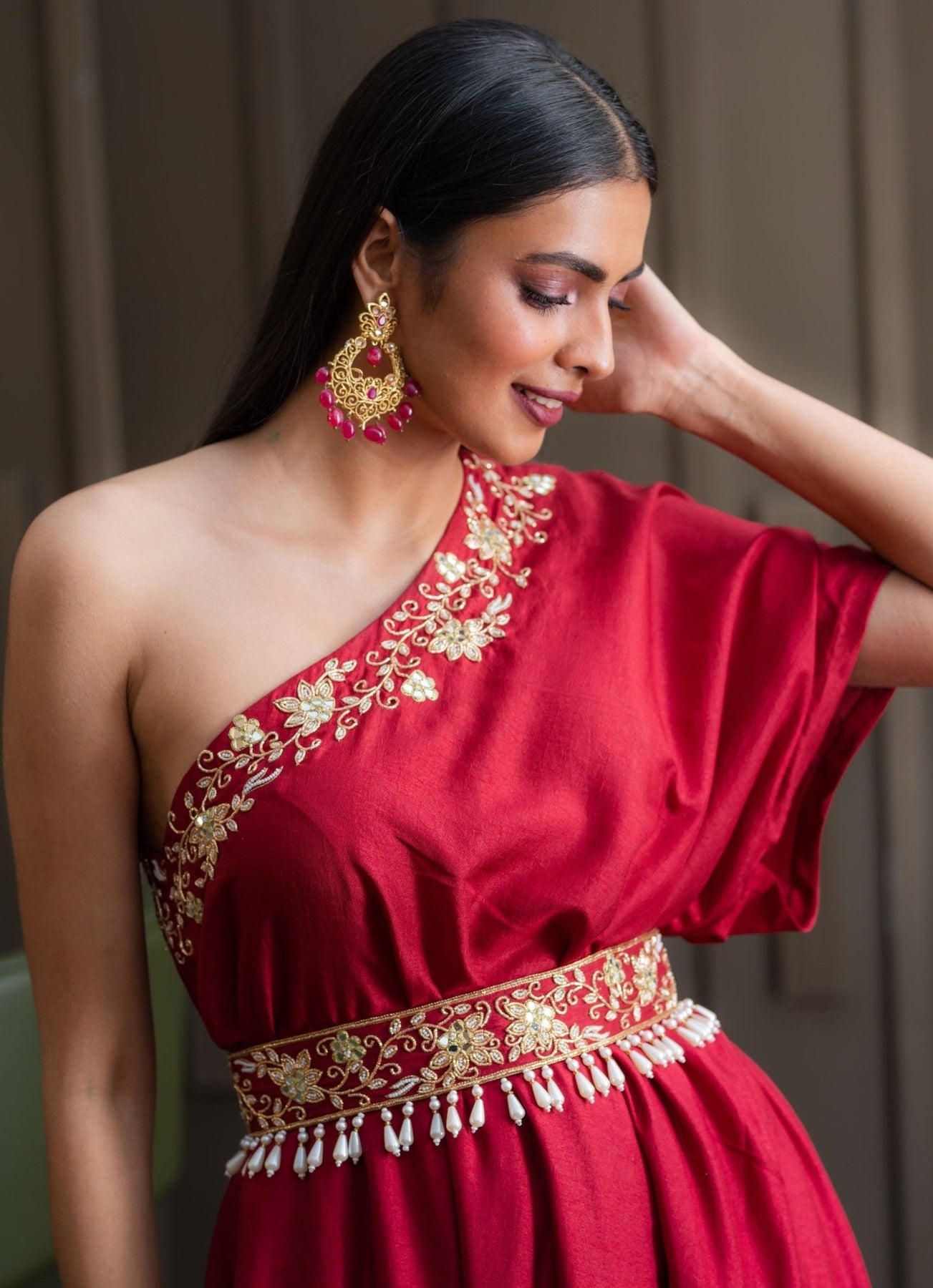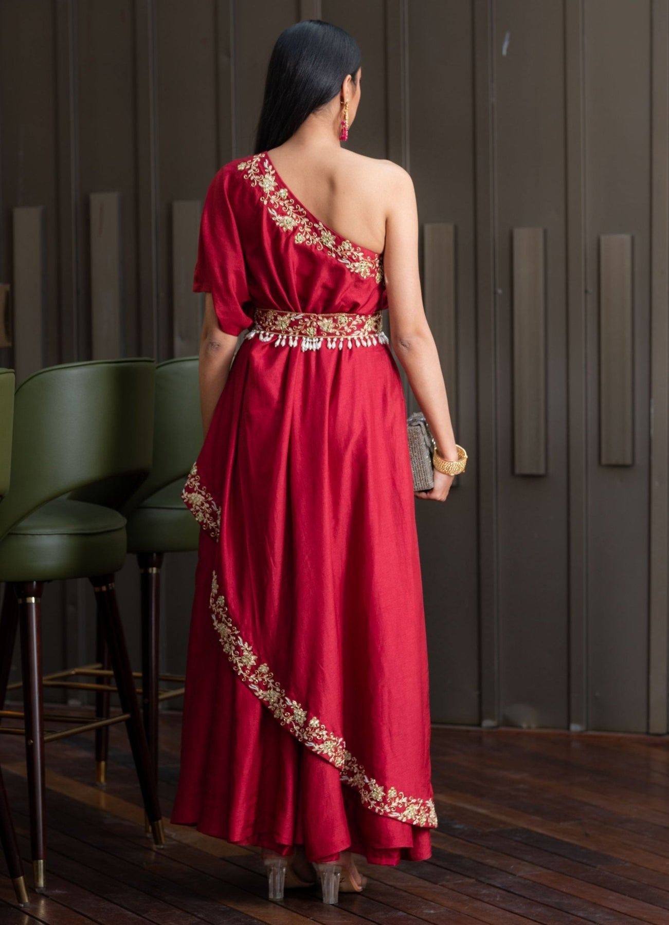 Maroon one shoulder gown hand embroidered with mirror, sequins and zardosi teamed with hand embroidered belt