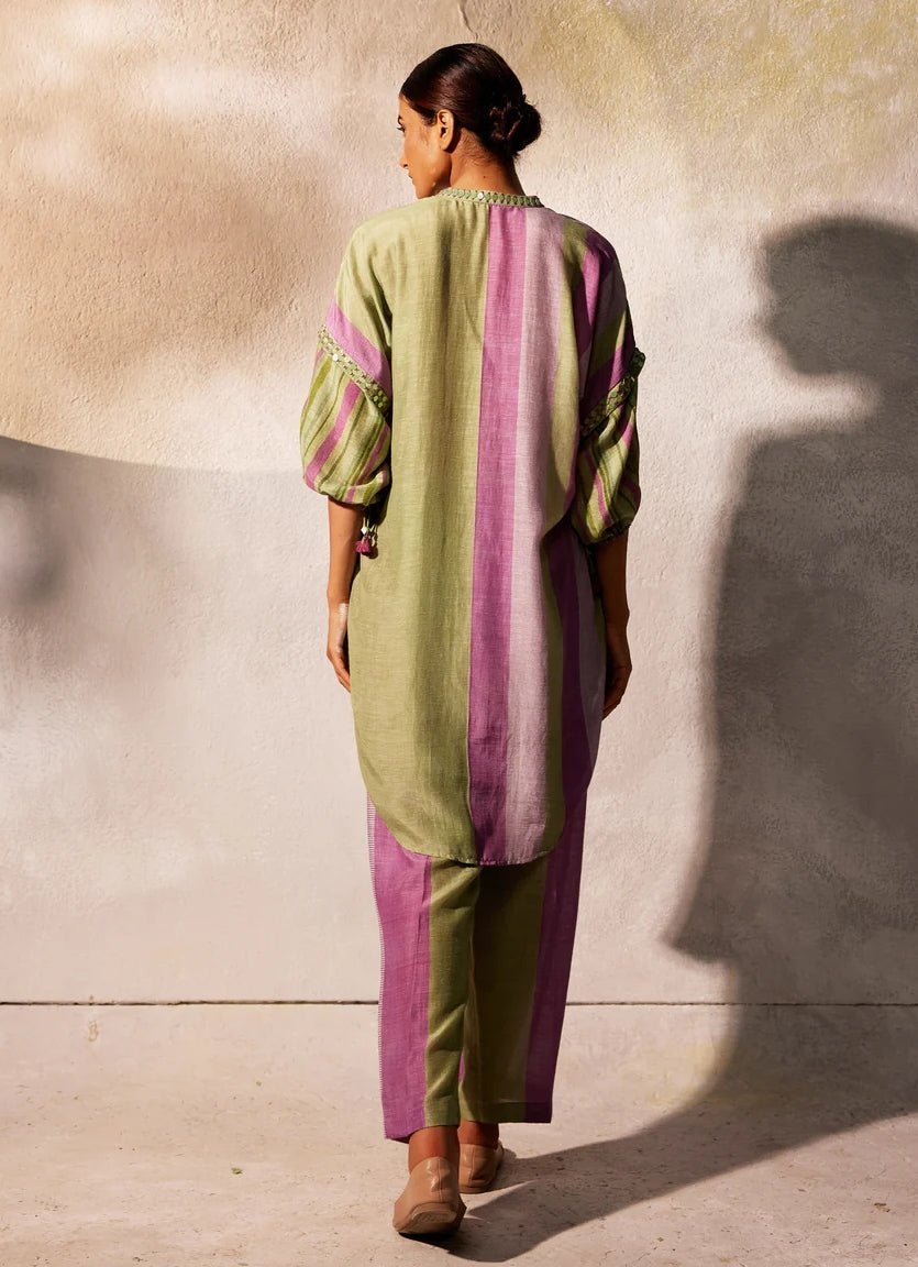 Green Dual - Tone Linen Silk Tunic Pants Set Basil Leaf - Fabilicious Fashion