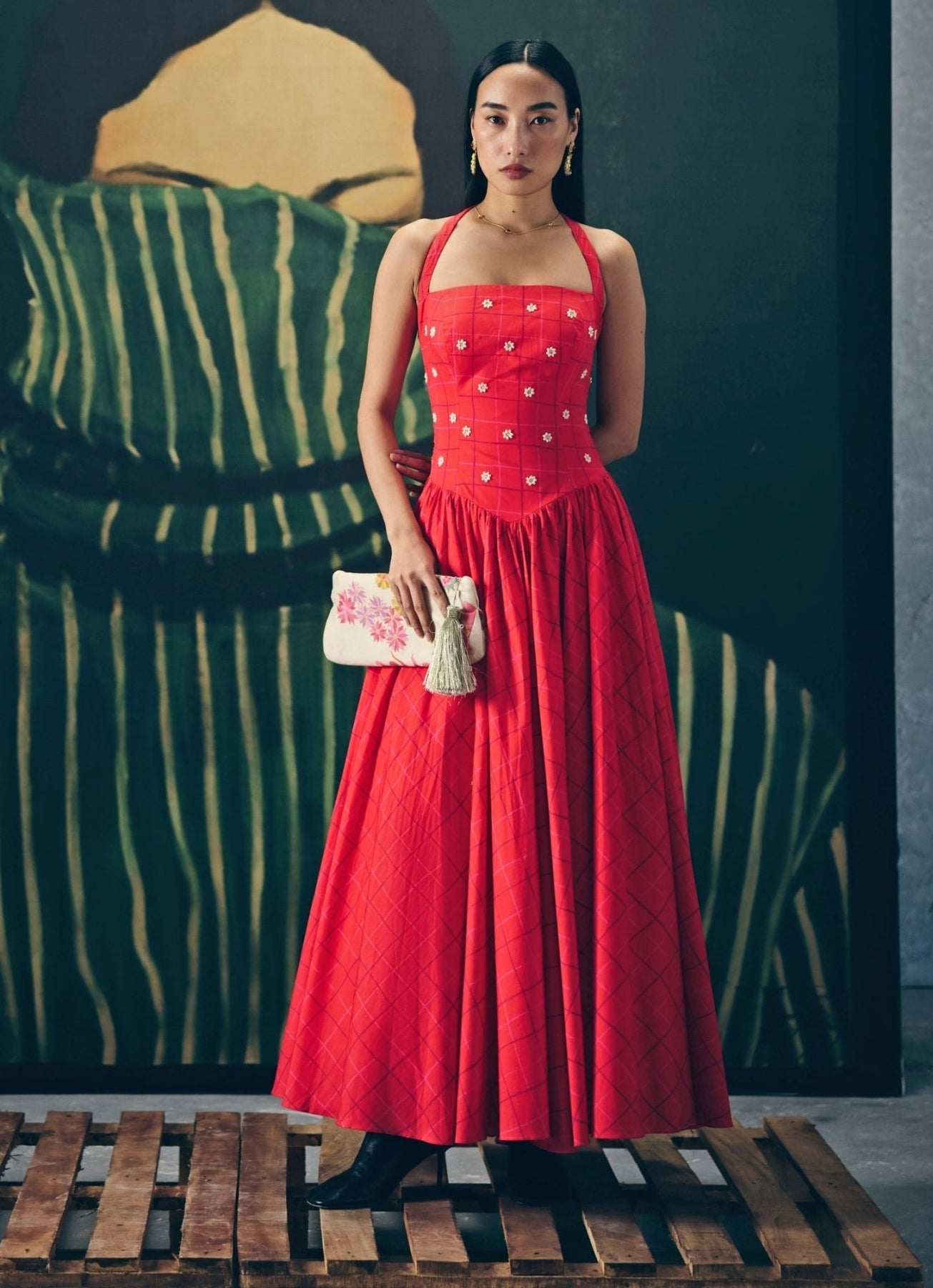 Capture the spirit of modern celebrations in Red Checked Corset Dress designed for summer celebrations. The cotton blend dress features classic checks with delicate embroidery and gathering details that add dimension. Its structured corset bodice balances the relaxed skirt, making it ideal every occasion.