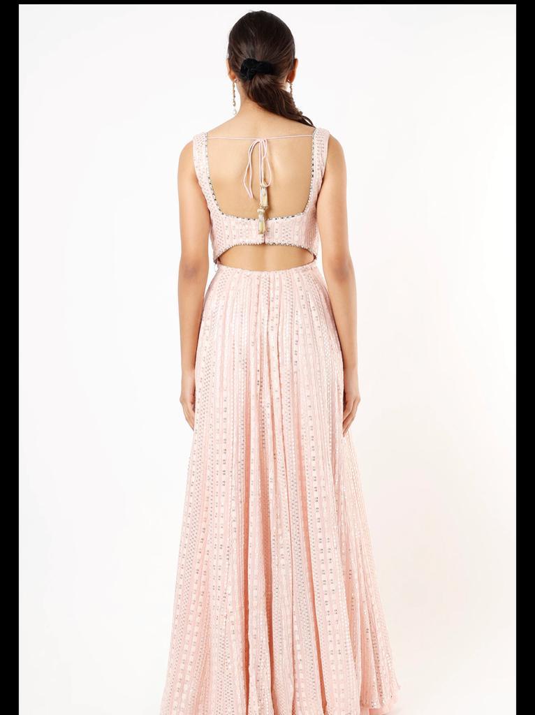 This look features a champagne blush anarkali gown set. The sleeveless ensemble has a square neckline with a back cutout at waist, embroidered all over with sequins and thread. A matching net dupatta with embroidered scallop lace and bootis completes the look.