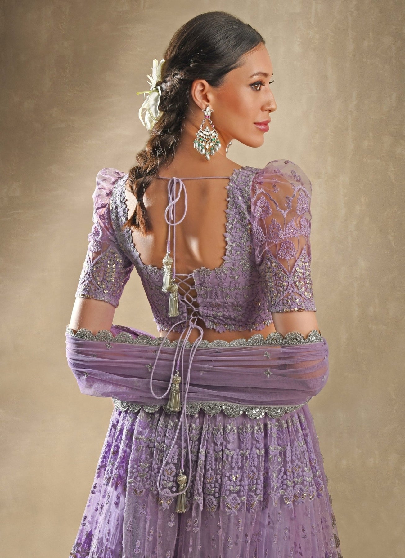 This enchanting Lilac Embroidered Net Lehenga Set exudes elegance. Made from Swiss net fabric, the lilac lehenga is beautifully adorned with intricate embroidery, combining delicate threadwork, dori detailing, and shimmering silver sequins that catch the light with every step. Paired with a stylish puff-sleeved blouse with a wide square neckline, it adds a modern flair to the traditional look. Completed with a matching soft net dupatta, designed with subtle buttis and a gracefully scalloped border, it lends a touch of refined charm. Thoughtfully crafted with practical elements, this lehenga includes cancan for a voluminous effect and convenient pockets for a blend of fashion and functionality.