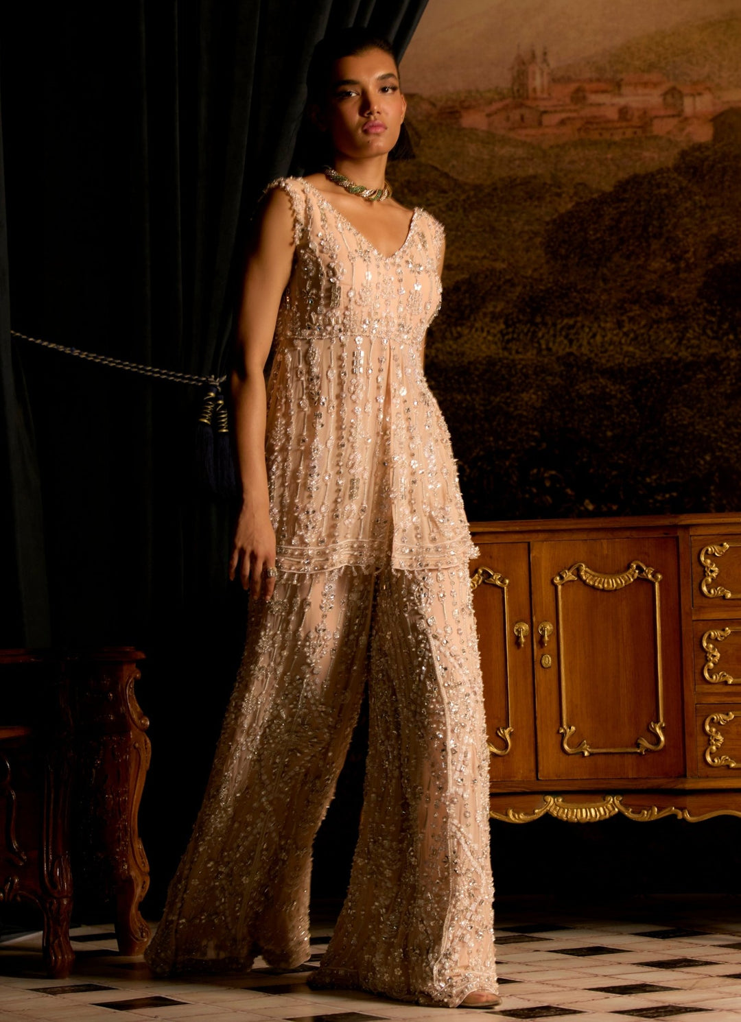 Soft, feminine, and full of charm, this Peach Peplum Kurta Sharara Set is crafted in airy chiffon for a graceful, flowy silhouette. The peplum kurta and sharara are intricately adorned with pearls, sequins, cutdana, and Swarovski embroidery, adding just the right amount of shimmer. Paired with a delicate net dupatta, the look is equal parts refined and festive.
