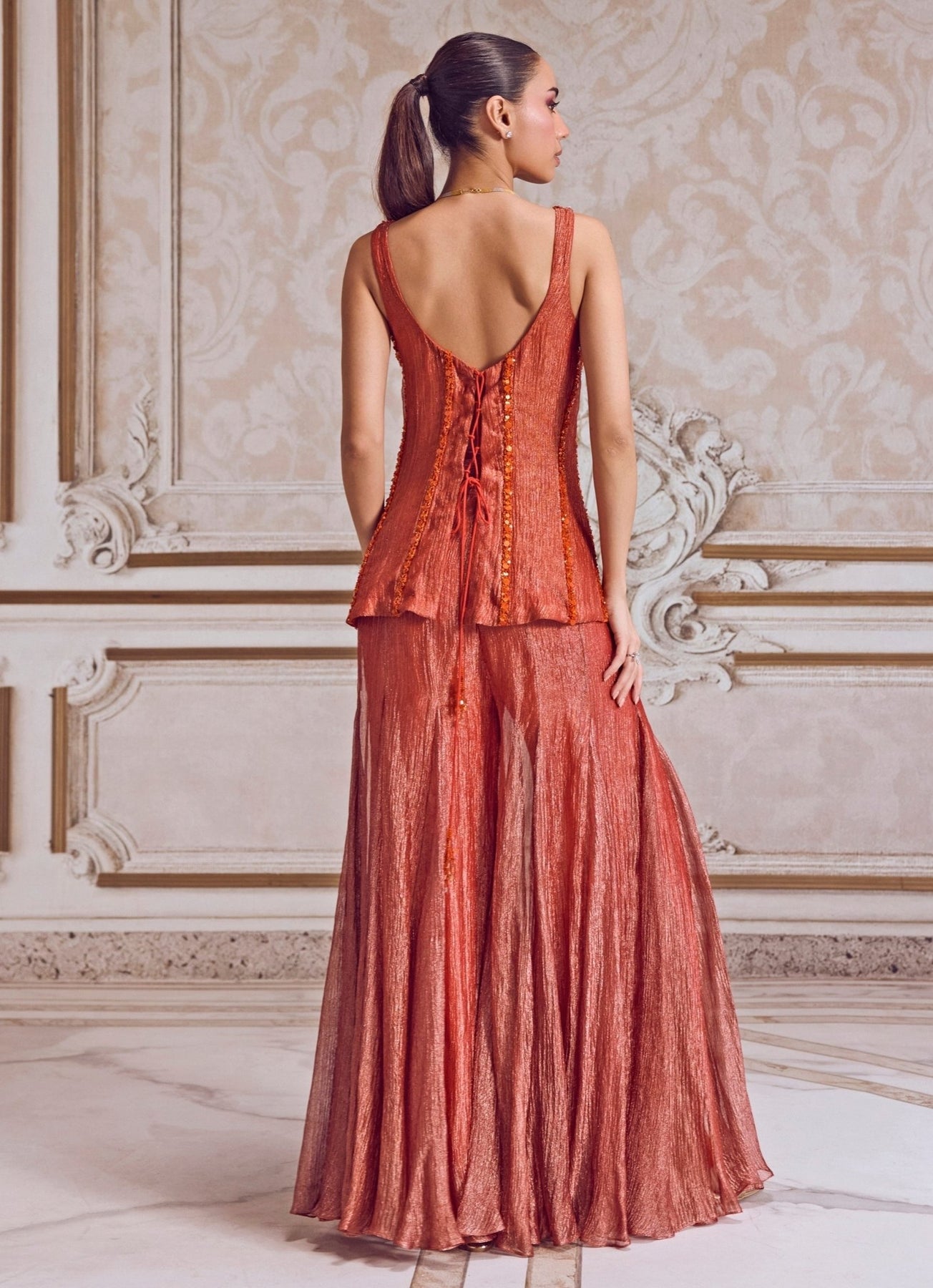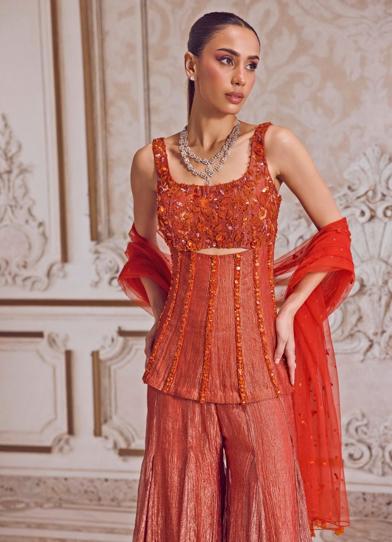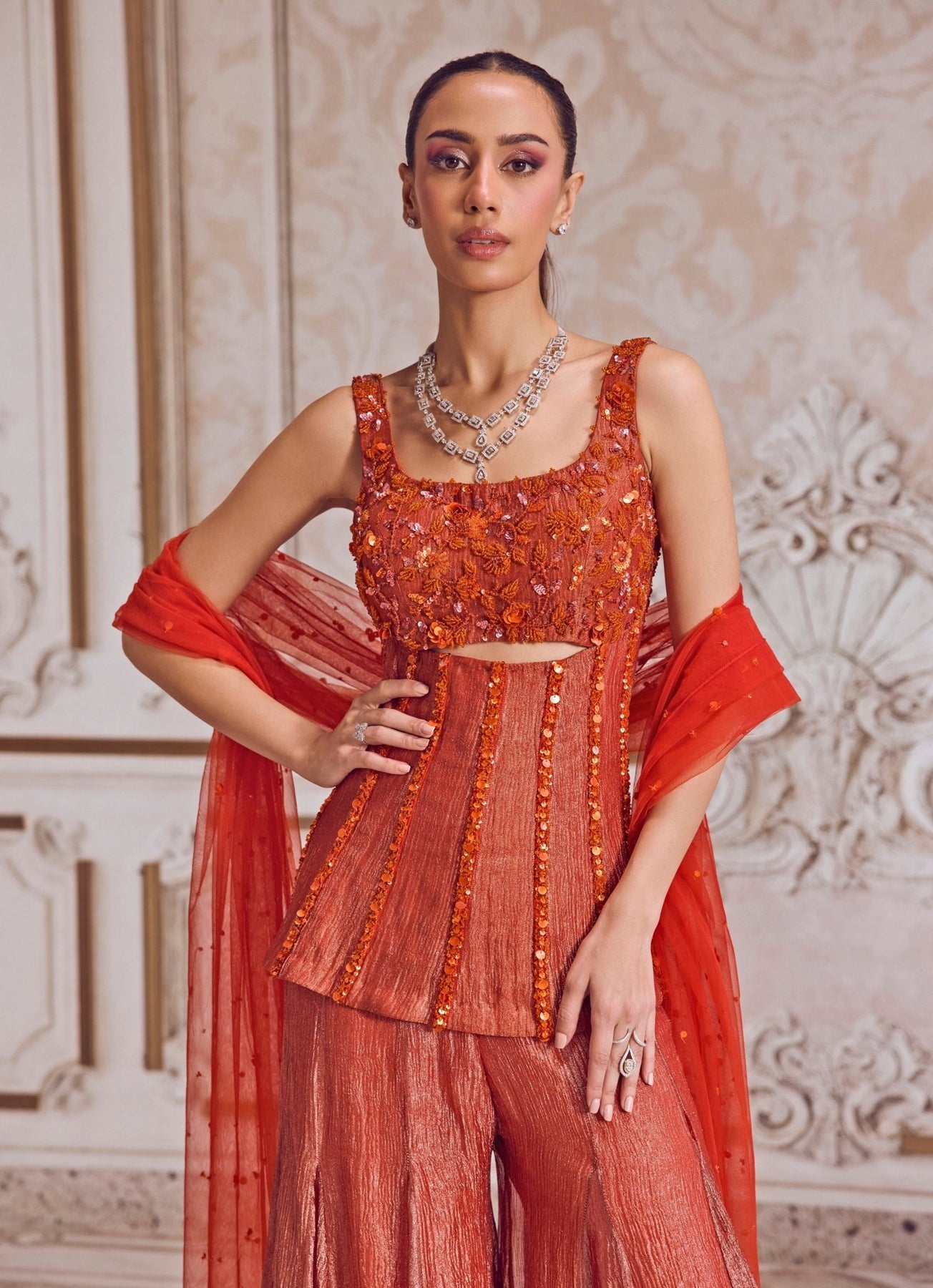Rust Orange Embroidered Tissue Sharara With Corset Sanya Gulati - Fabilicious Fashion
