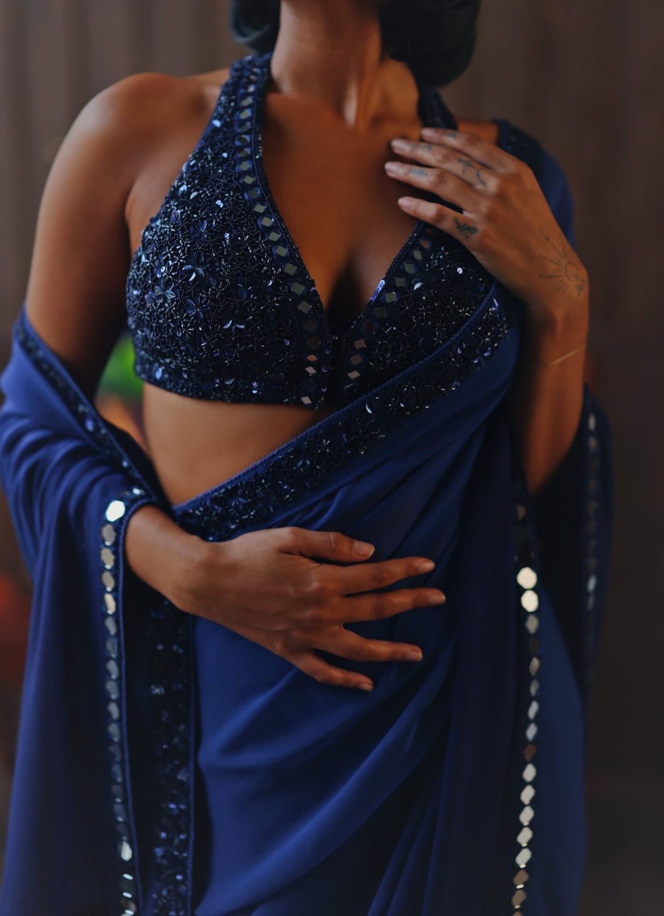 Celebrate your loved one’s big day in the Blue Ombre Saree, where soft ombre tones meet intricate craftsmanship. The saree flows in georgette adorned with a refined beadwork jaal, embellished borders, and delicate mirror accents, brought to life by long beaded tassels that add graceful movement. Paired with a beautifully structured deep V-neck blouse enriched with beads, sequins, and mirrorwork, it blends timeless artistry with modern sophistication.