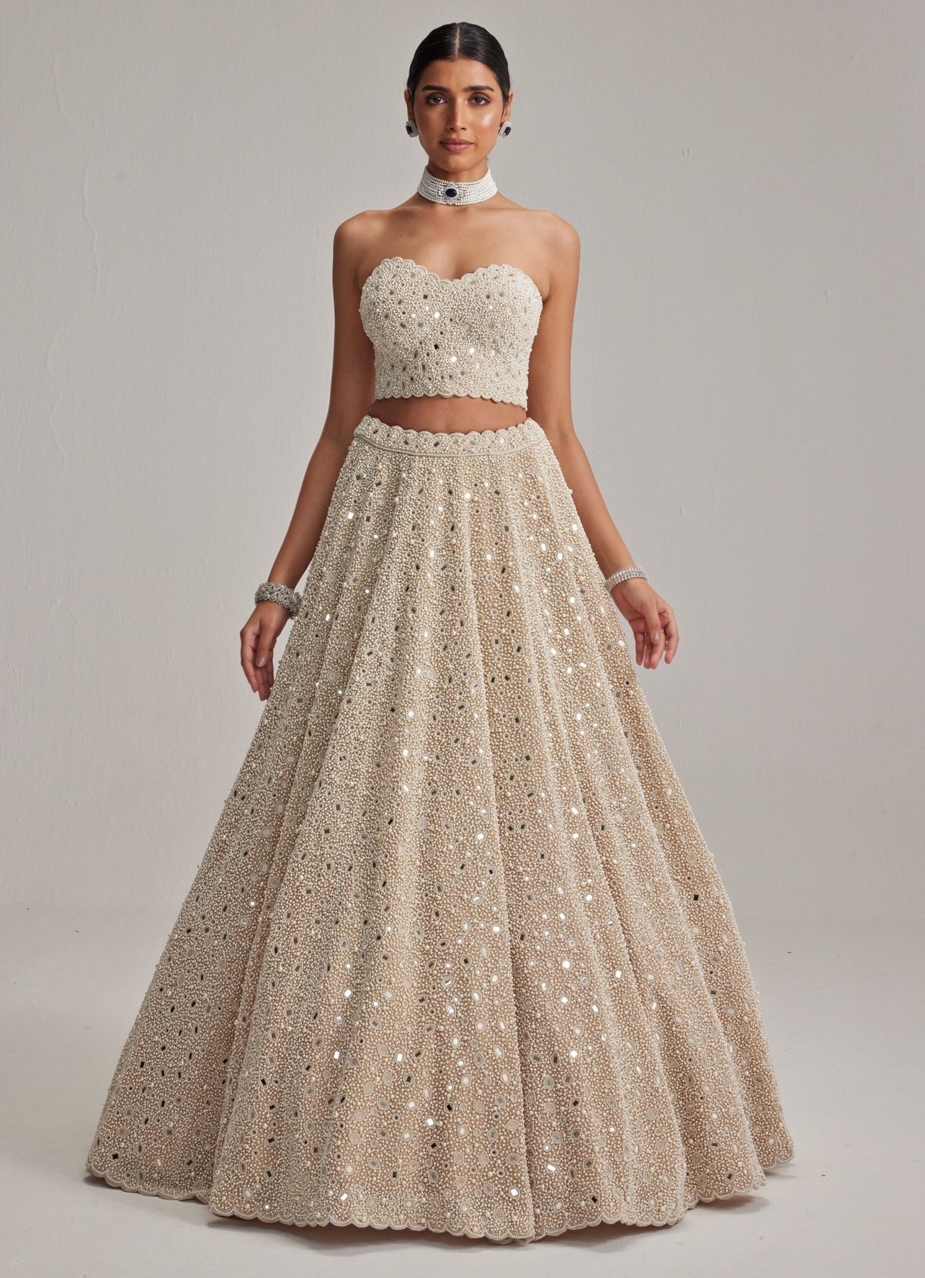 Capture the essence of your dream wedding in this beige-gold organza lehenga, where craftsmanship meets modern romance. The lightweight organza skirt glows with mirror and pearl embroidery, while the corset-style georgette blouse enhances your shape with architectural precision. A soft, glistening dupatta completes the ensemble, blending drama with grace.