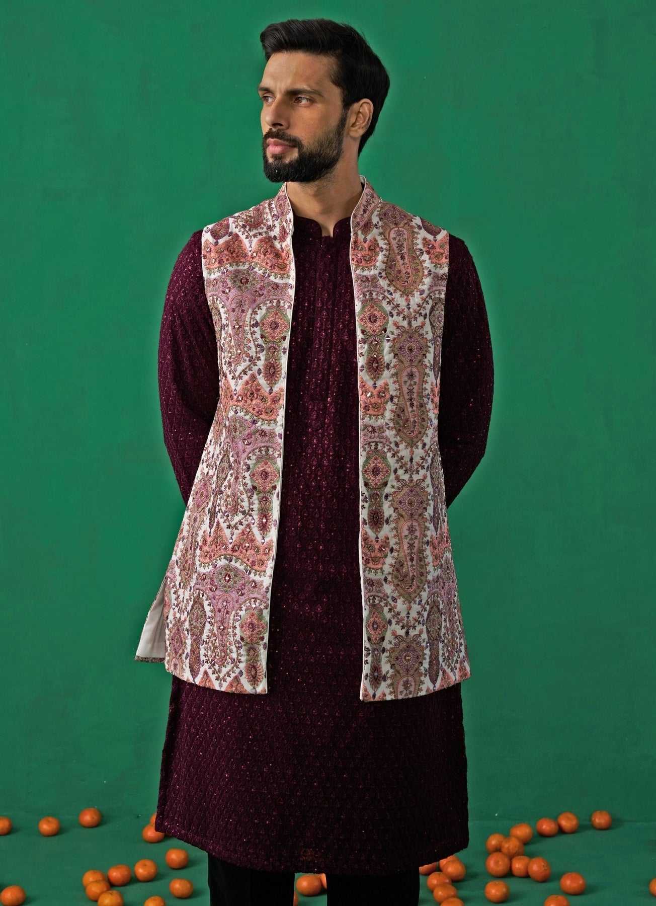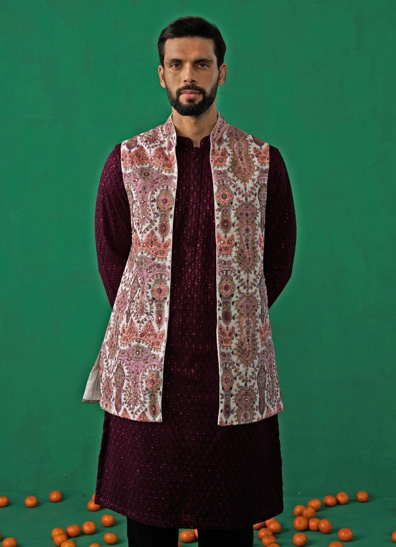 Make a vibrant statement in this multicolor embroidered georgette kurta jacket set, a refined ensemble that beautifully merges artistry and modern elegance. The long-sleeved dark kurta features a subtle all-over embroidered texture, paired with straight-cut trousers for a balanced and polished look. The highlight of the outfit is the sleeveless jacket, richly adorned with dense Kashmiri-inspired embroidery in multicolor threads that add vibrance and depth.