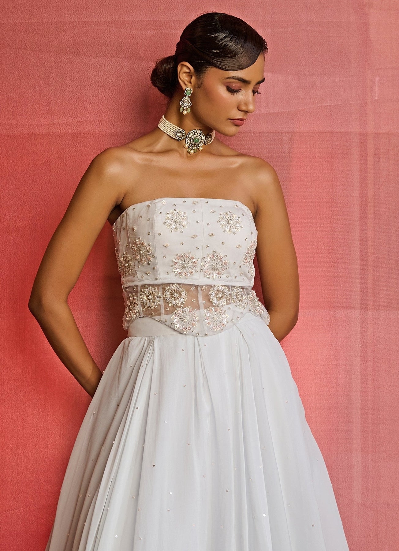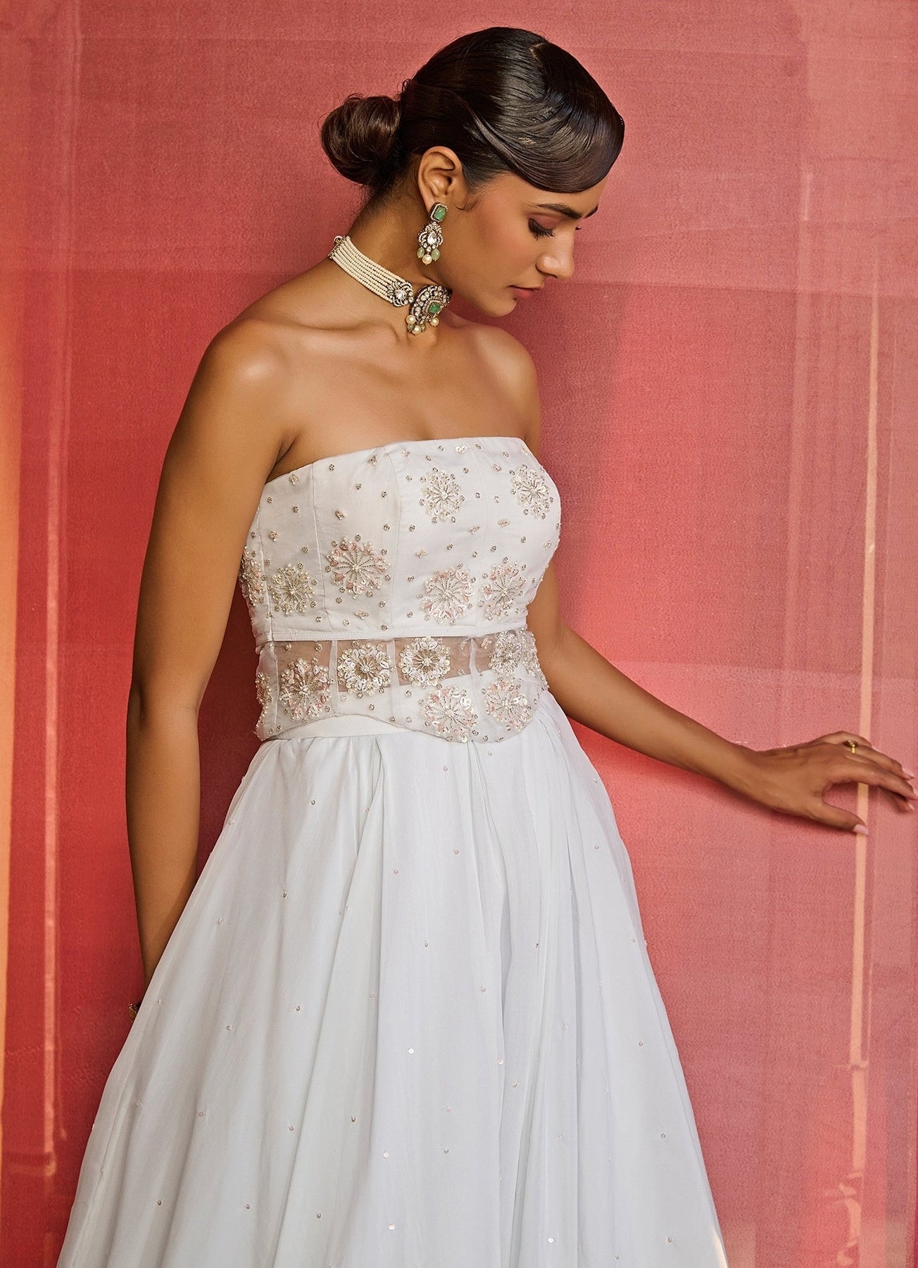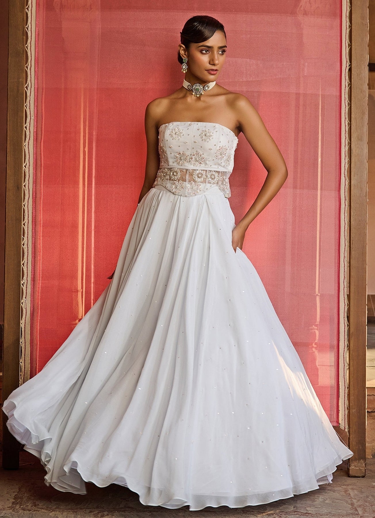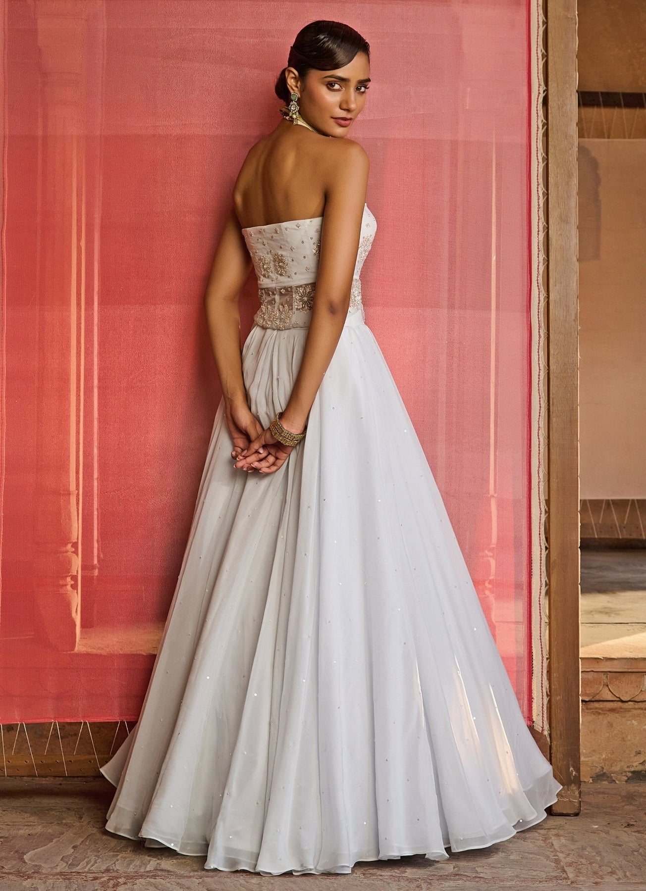 Dress the brief—refined, festive, unforgettable—in the Cloud Blue Embroidered Corset Lehenga Set. The organza skirt moves with fluid elegance, its box pleats richly adorned with intricate hand embroidery that shimmer softly under light. The corset blouse, crafted in organza, features detailed embroidery and a flattering side opening, adding a touch of modern refinement. Completing the look, a sheer silk organza jacket layered with dainty motifs lends a graceful finish.