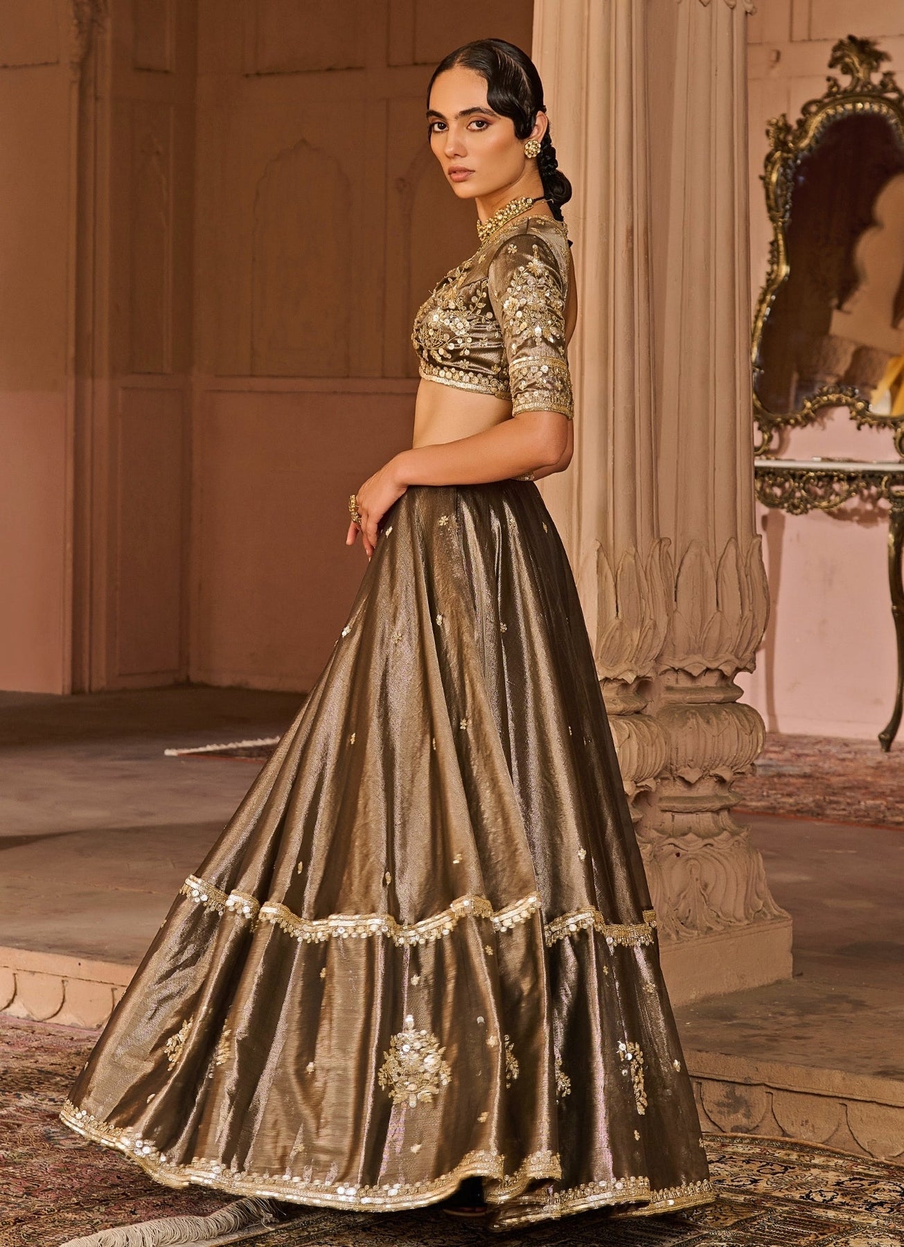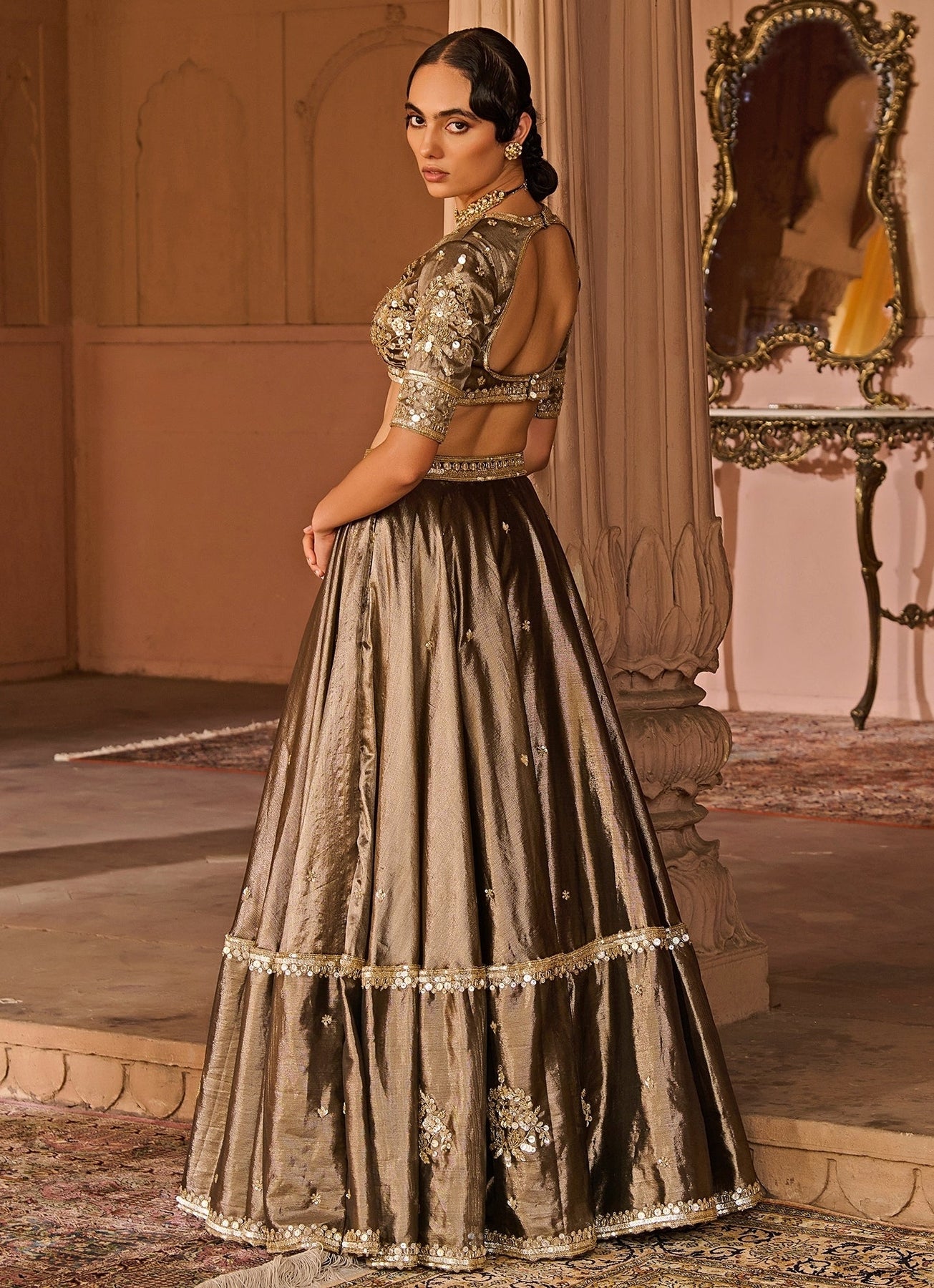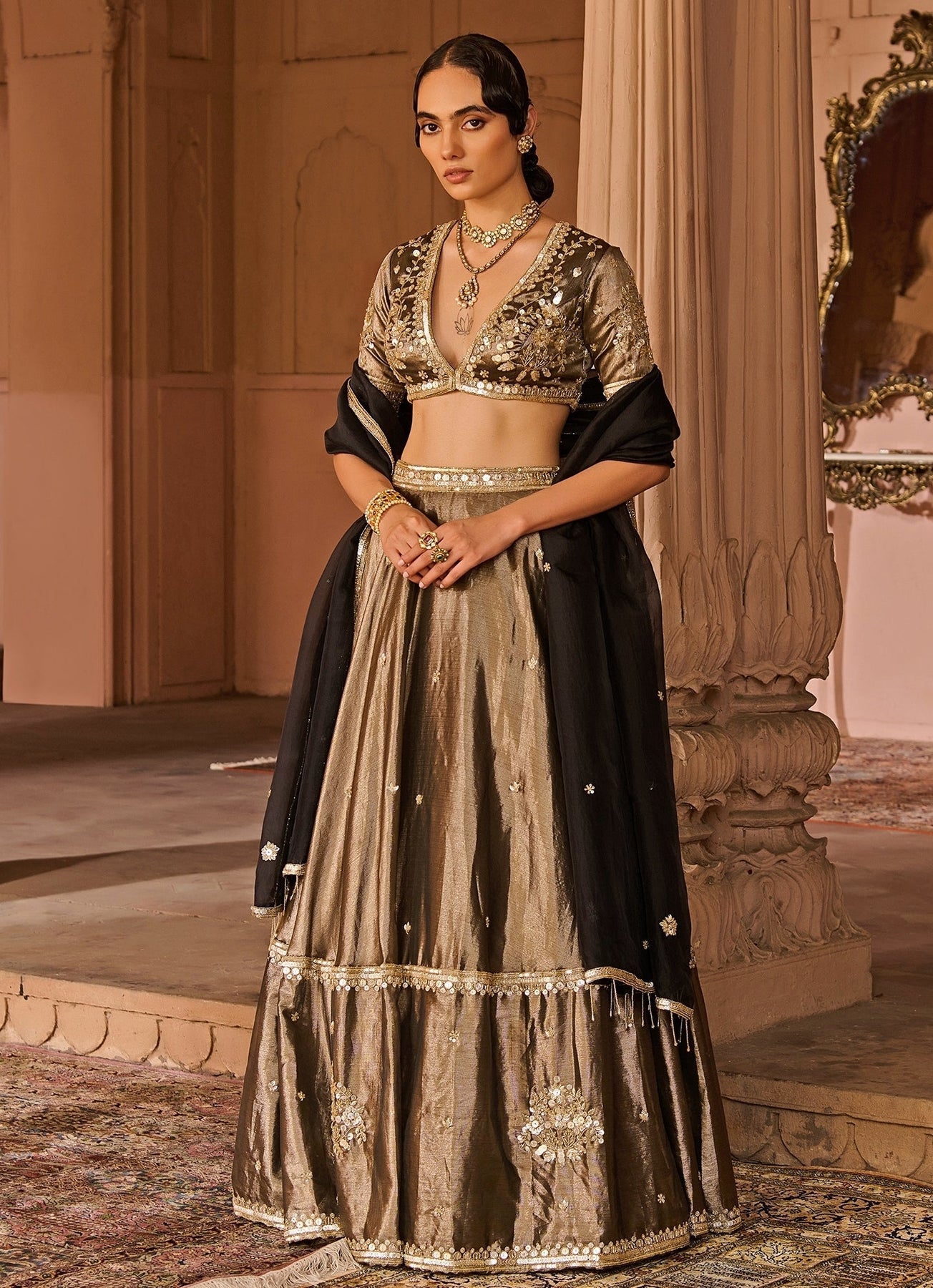 Copper And Black Embroidered Tissue Lehenga Set