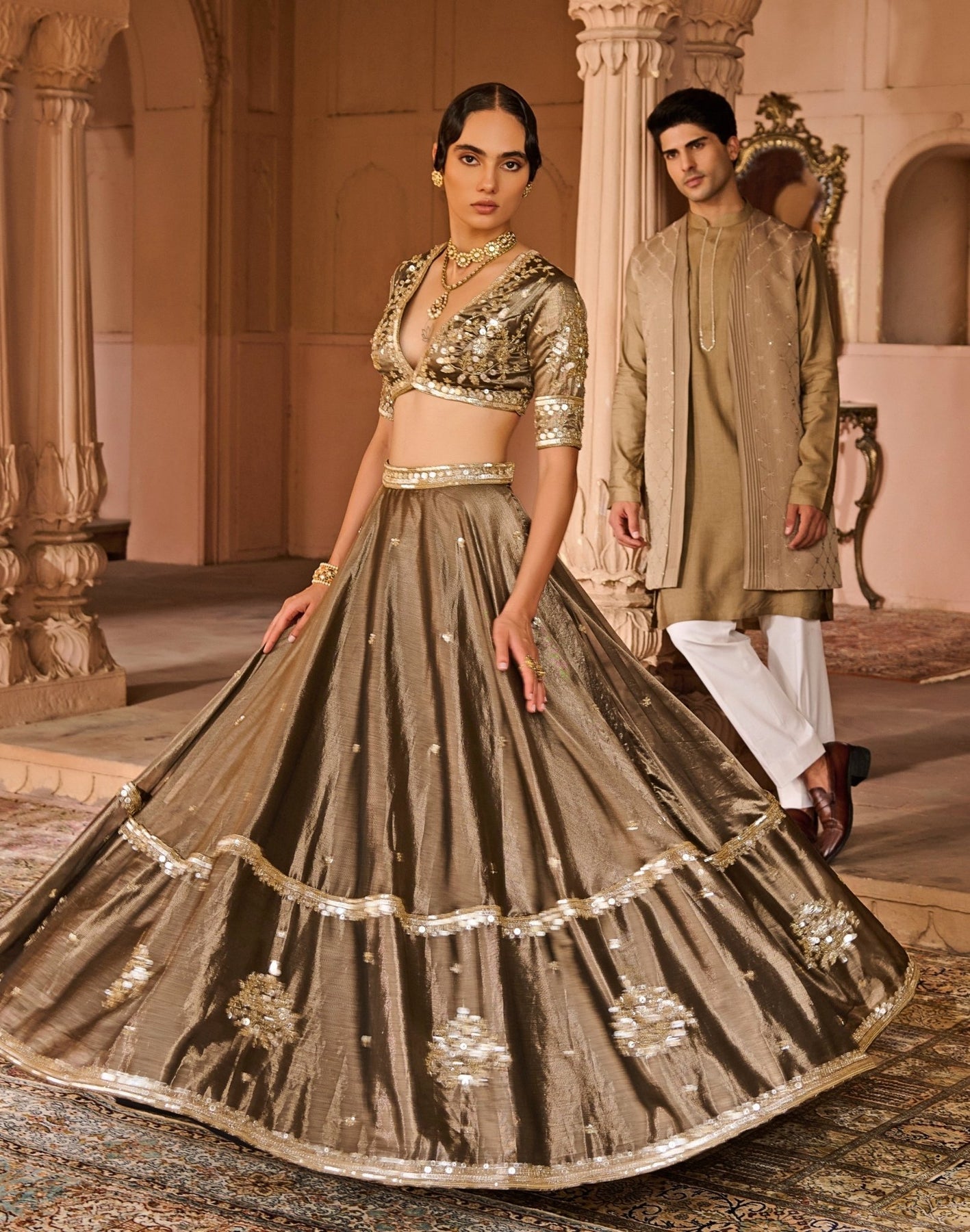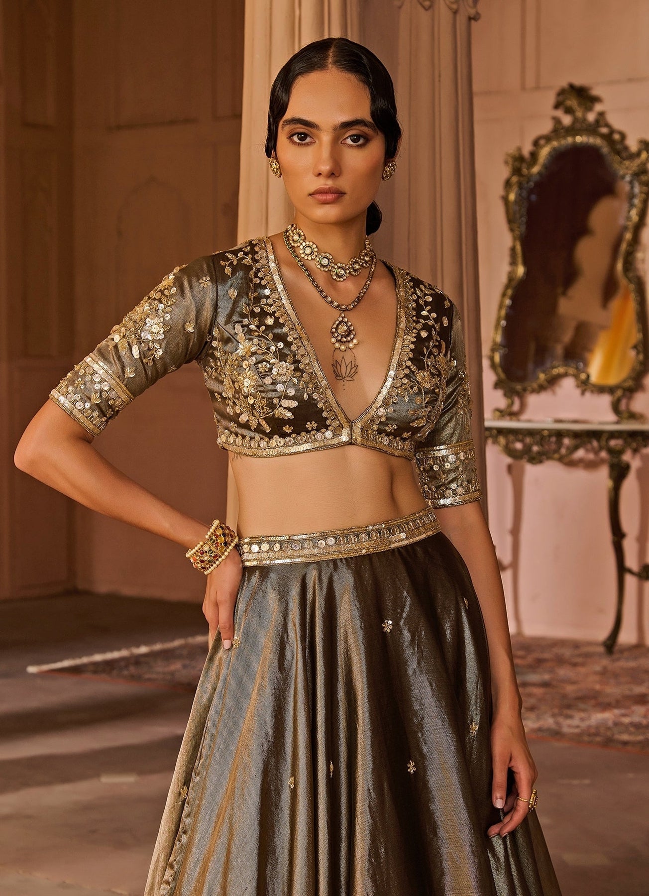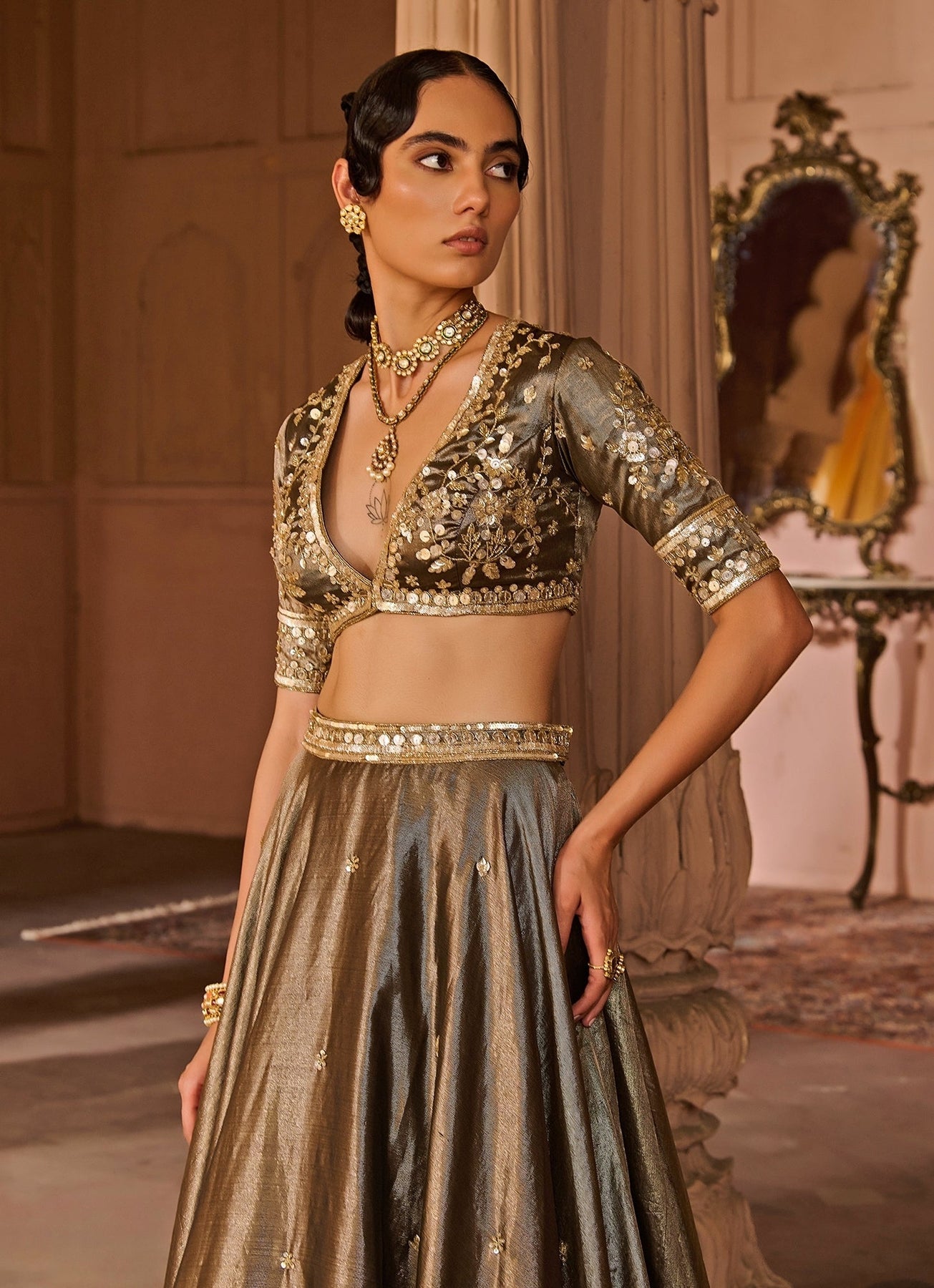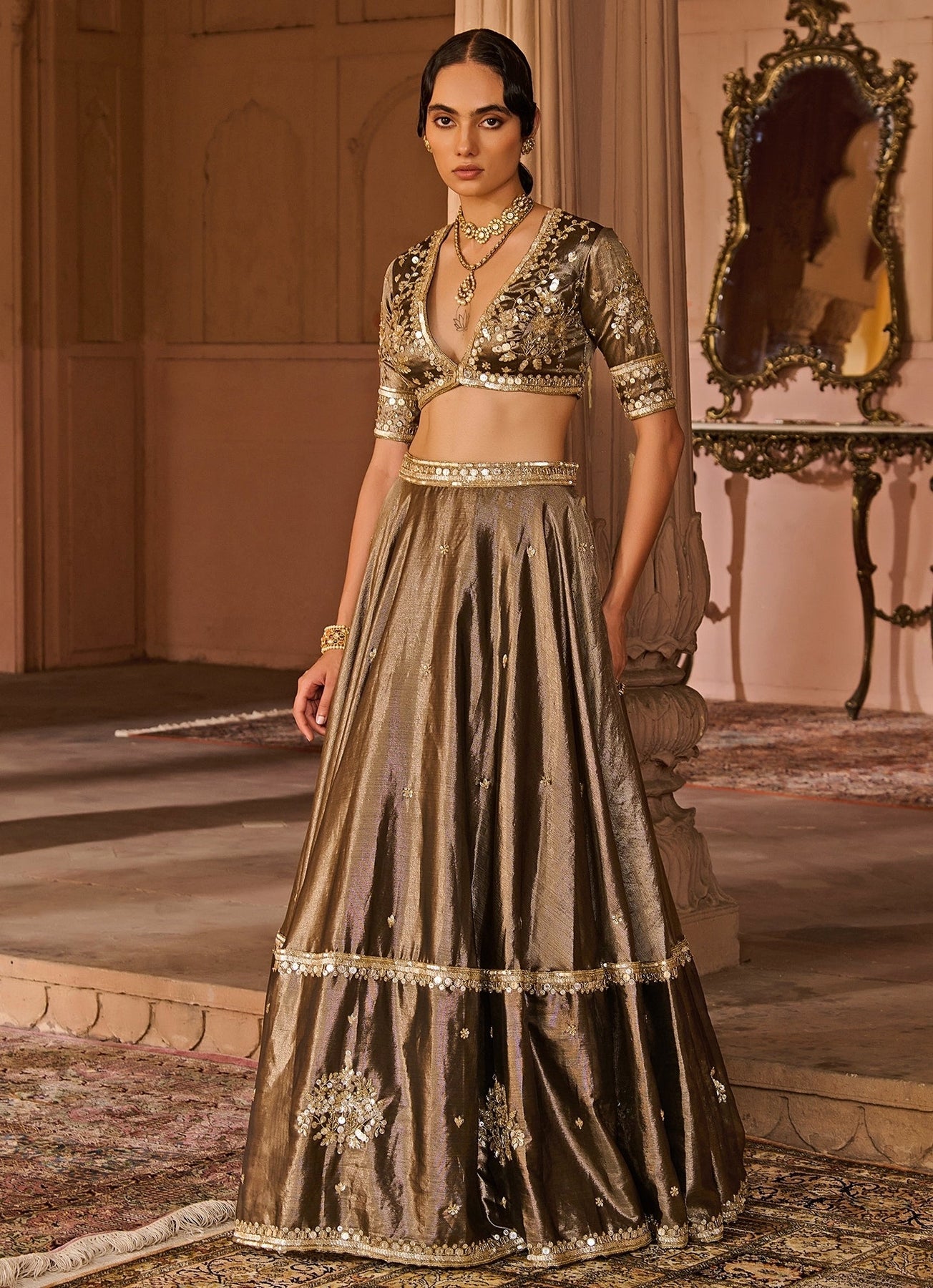 Copper And Black Embroidered Tissue Lehenga Set