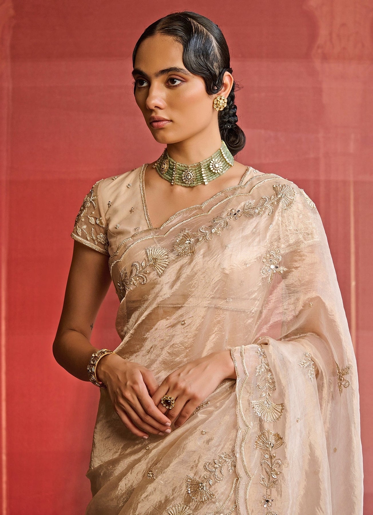Step into timeless sophistication for family occasions with the Rose Gold Saree. The silk tissue saree shimmers beautifully under soft light, adorned with intricate floral motifs and a richly hand-embroidered border that exudes opulent charm. Paired with a delicate net blouse featuring embroidered short sleeves and scattered motifs, it strikes the perfect balance between classic refinement and contemporary grace.