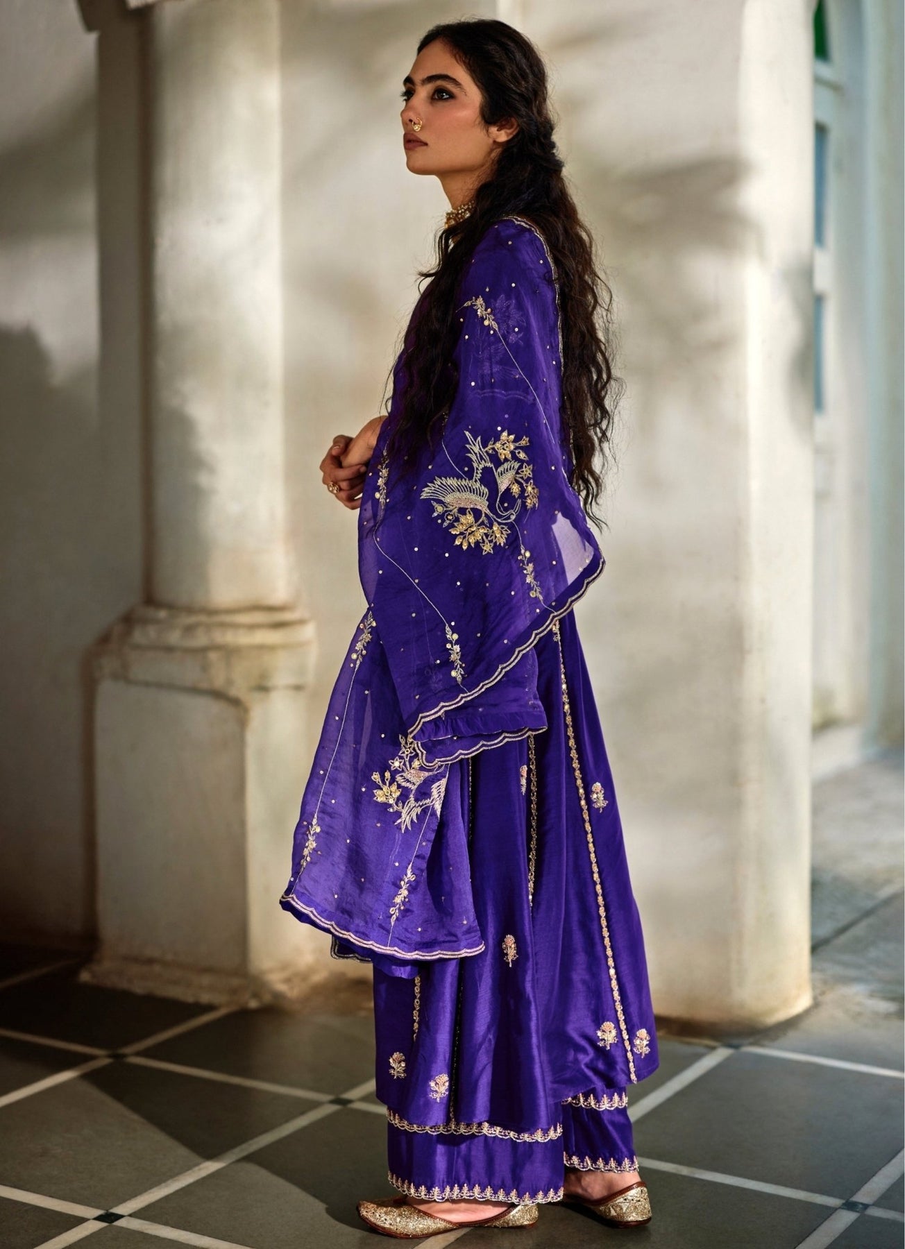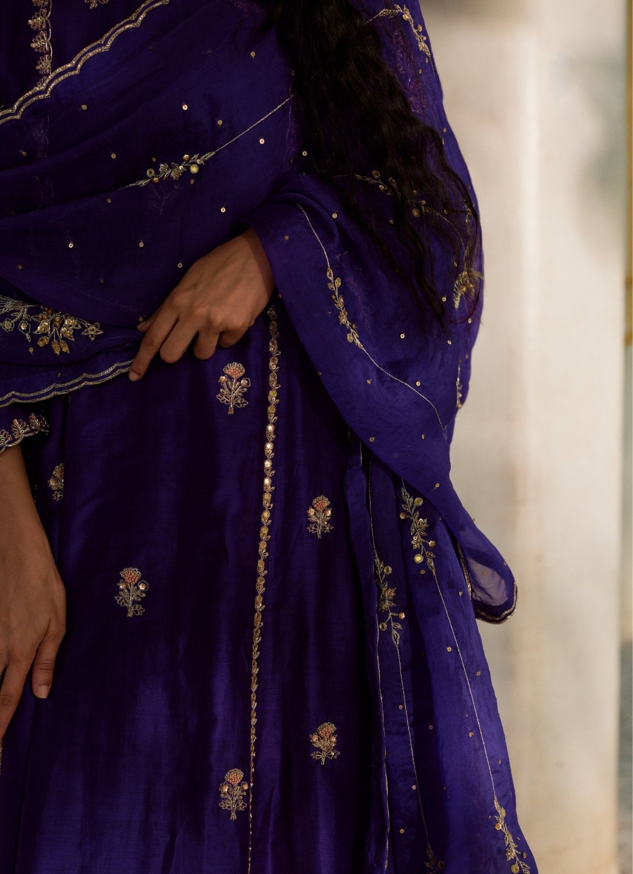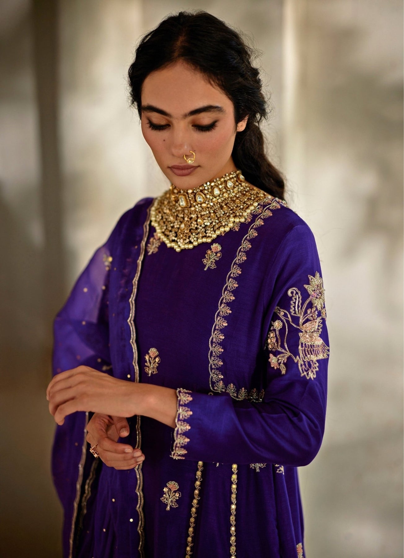 Bring destination-ready glamour to family occasions in this regal Purple Anarkali with matching pants. Intricate aari and zardozi hand embroidery in gold highlights signature motifs, creating a rich contrast that feels ceremonial yet modern. The dupatta is delicately embroidered with scalloped edges for a polished finish that photographs beautifully. Style with a sleek bun and a statement clutch for dinner after sundown.