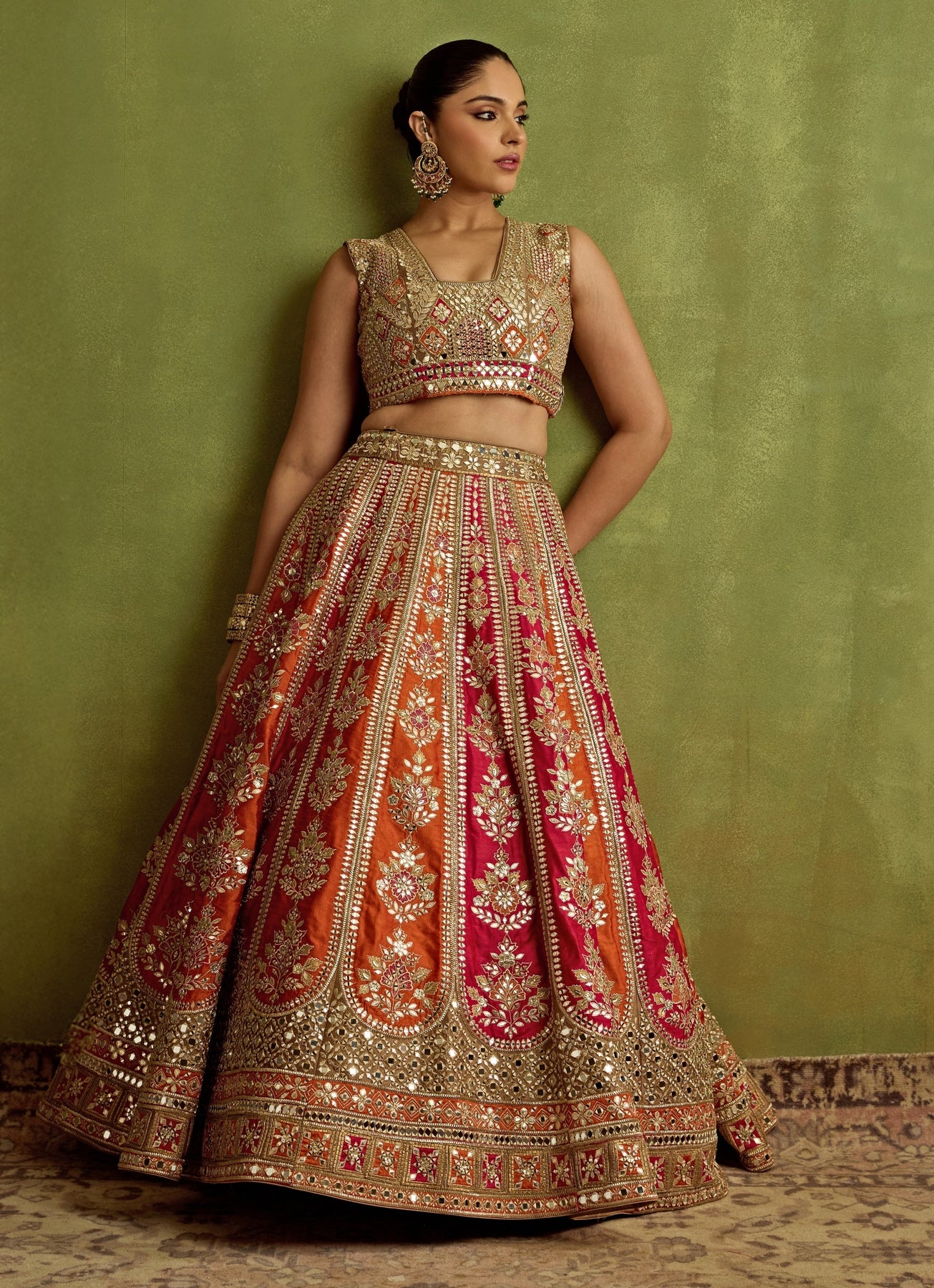 Radiate festive charm in this Orange and Hot Pink Silk Lehenga Set, beautifully adorned with zari and mirrorwork for a luminous finish. The vibrant lehenga and coordinating blouse in coral-orange tones exude effortless elegance, while the sheer organza dupatta adds a soft, glistening touch that enhances the lehenga set.