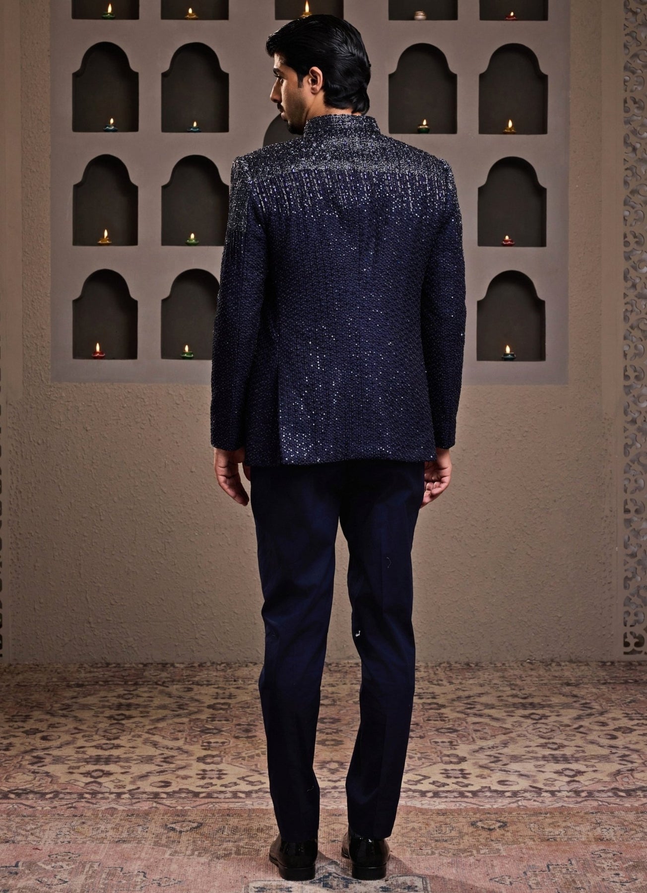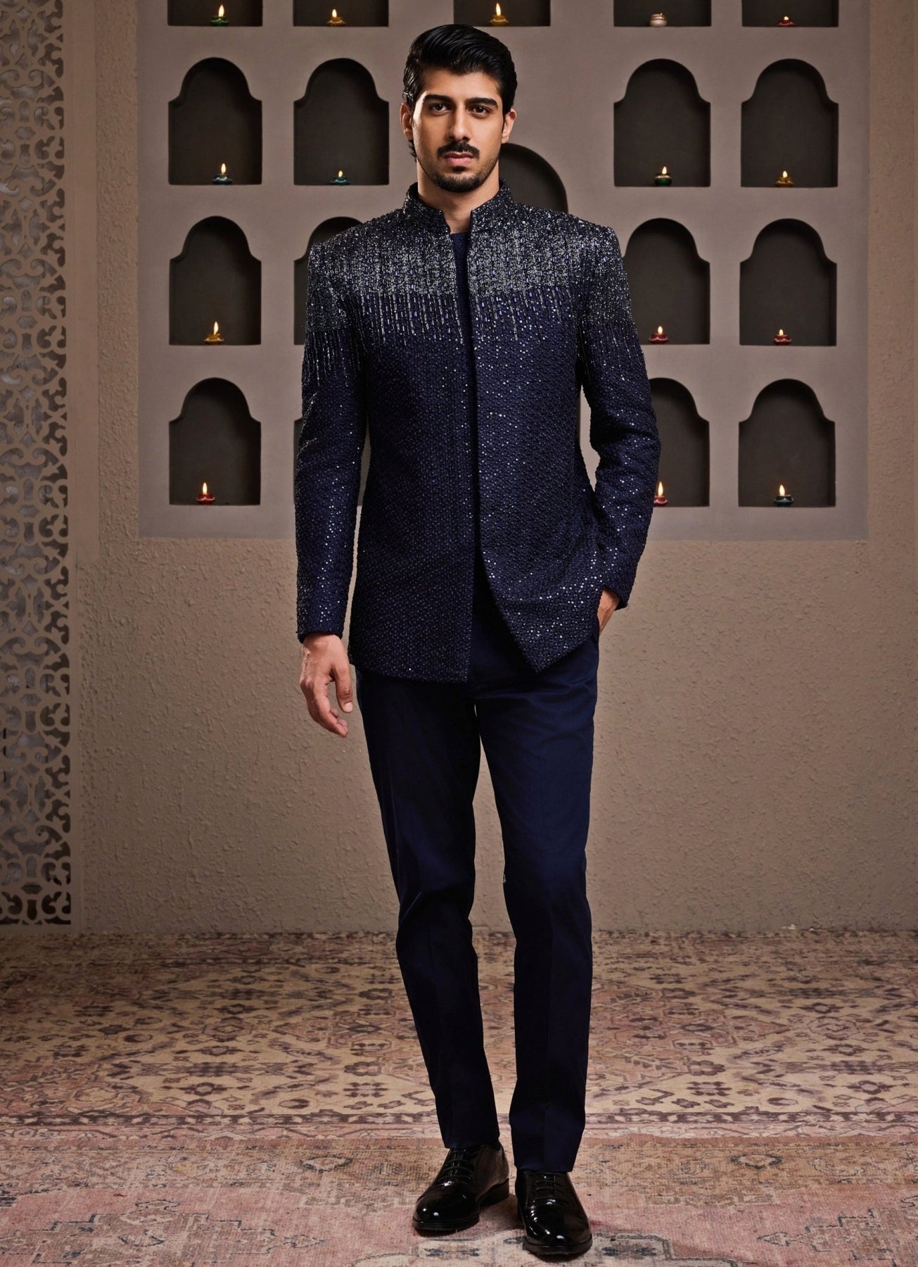 Heritage romance meets modern refinement in the deep Navy Blue Jodhpuri Set—an evening-ready ensemble with a luxe, tailored edge. The raw silk coat is embroidered all over in resham and highlighted with crystals, beads and sequins for a polished shine that catches light with every step, especially under stage spotlights. Paired with a cotton lycra pant, it balances tradition with a clean contemporary finish.