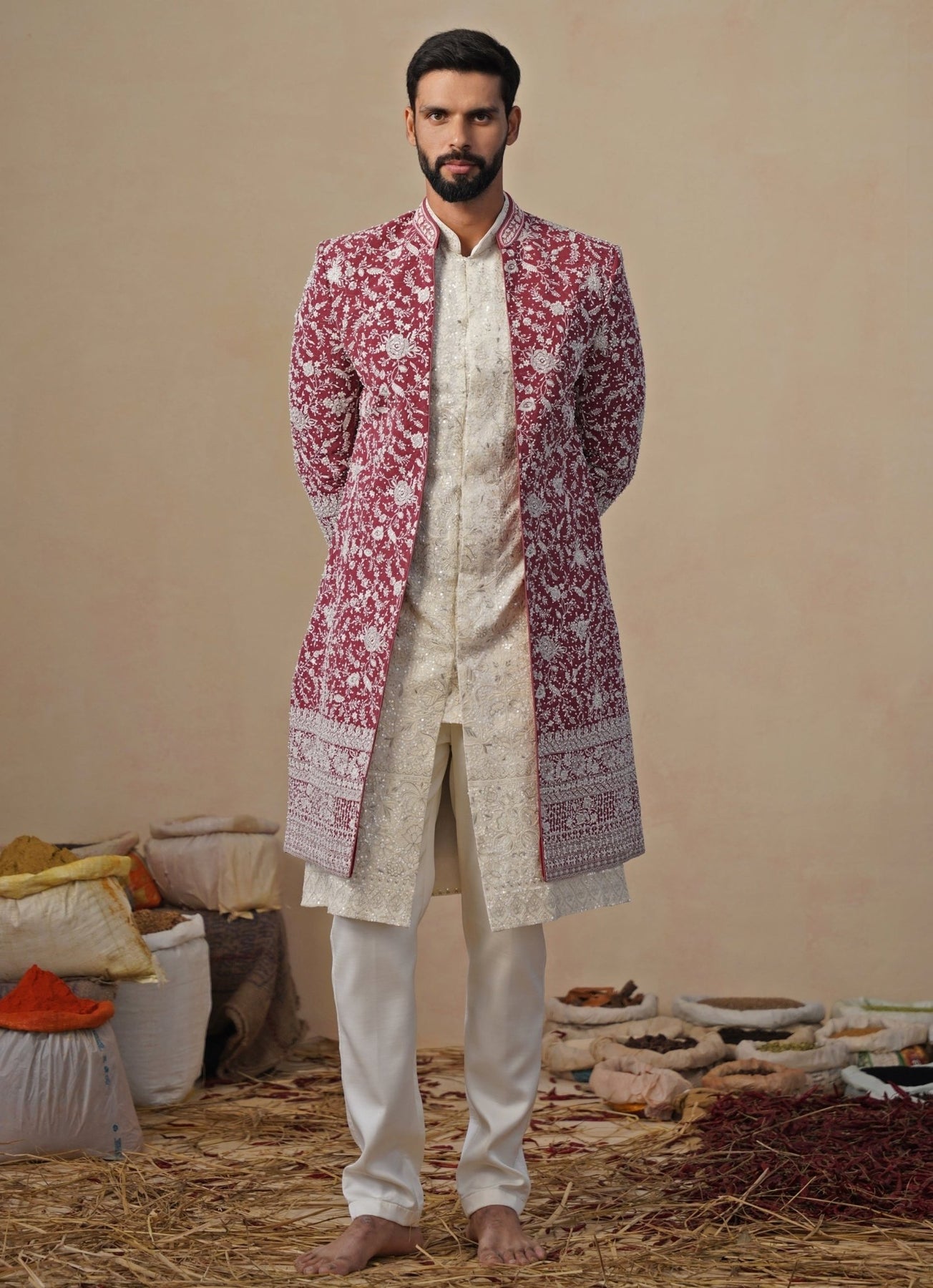 Celebrate statement dressing with the Ivory and Maroon Red Indo-western Kurta Jacket Set. Sleek straight pants create a sharp base, paired with a coordinated inner kurta detailed in fine tonal work for depth. The front-open long jacket adds drama with cutdana embroidery in floral and ornamental motifs, delivering a subtle sheen and artisanal richness that photographs beautifully from every angle.