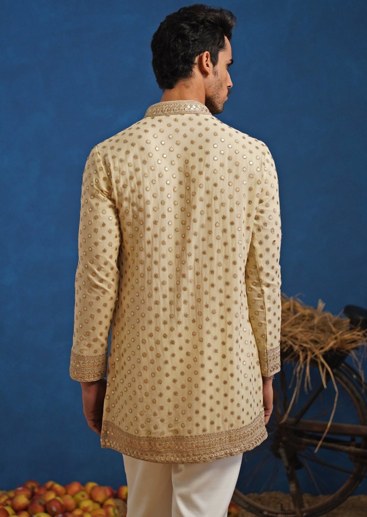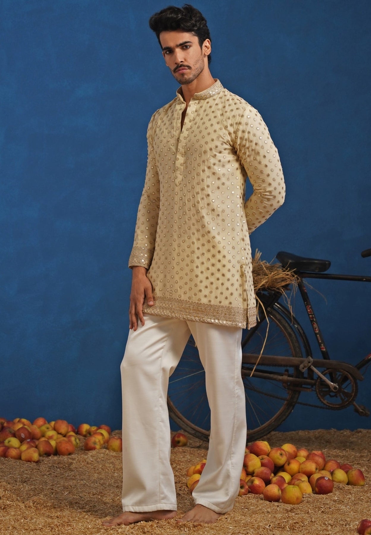 Keep your celebration style refined in this Cream Short Kurta Set with quiet luxury. Straight pants create a sleek finish, paired with a georgette kurta featuring subtle all-over embroidery for gentle texture and depth. A minimal placket and straight hem sharpen the contemporary feel, making it easy to wear from engagement gatherings to elegant daytime functions with effortless polish.