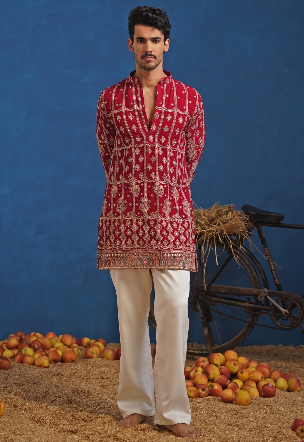Bring bold festivity to destination celebrations in this Hot Pink Short Kurta Set. Straight pants keep the look crisp, while the georgette kurta with band collar and full sleeves is elevated by balanced thread embroidery that adds refined texture. Cut above the knee, it feels contemporary and effortless for evening functions, pairing beautifully with classic footwear and minimal accessories.