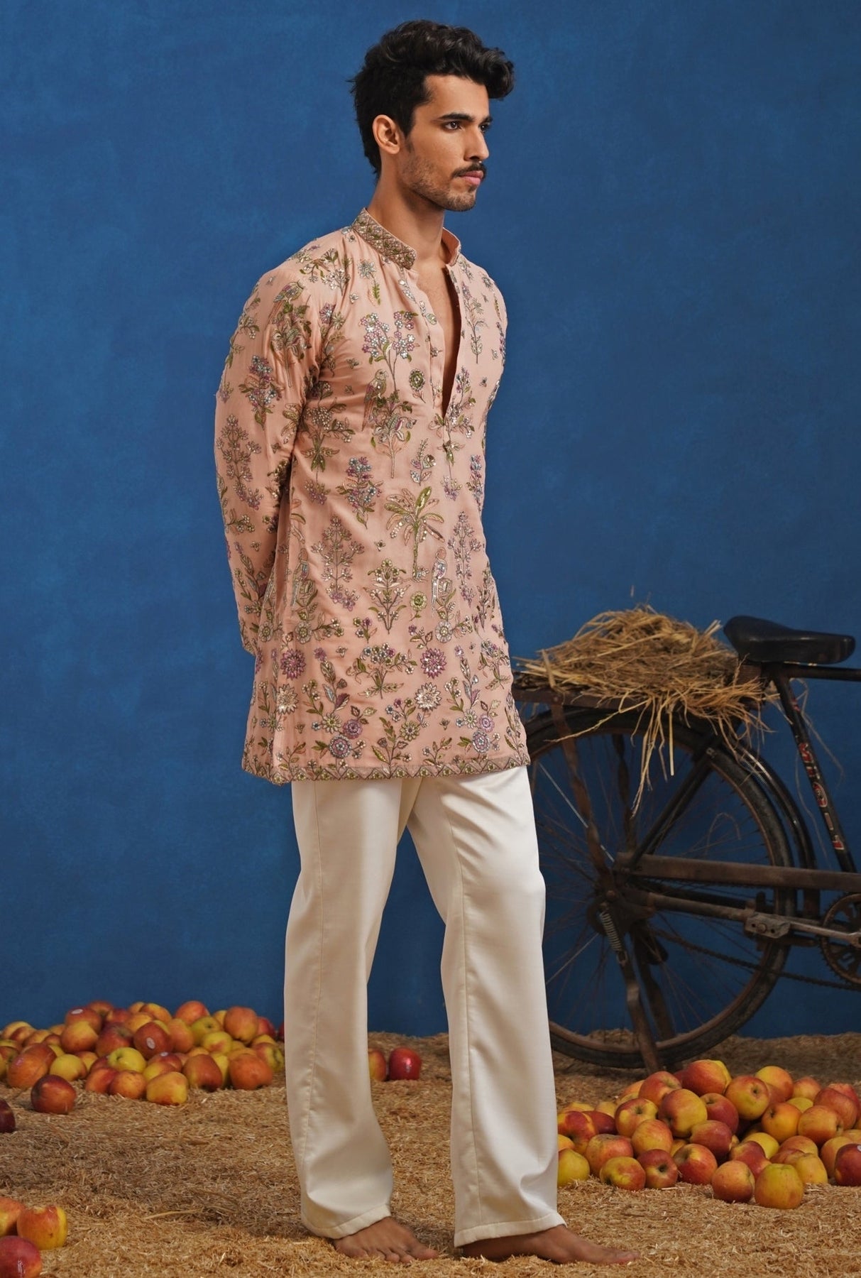 Make a soft yet striking statement as a wedding guest in this Pastel Pink Short Kurta Set. Straight pants keep the look tailored, while the georgette kurta with band collar and full sleeves is enriched with nature-inspired thread embroidery, arranged to create depth and movement across the surface. The above-knee cut adds modern ease for resort events, from sundown soirées to family gatherings.
