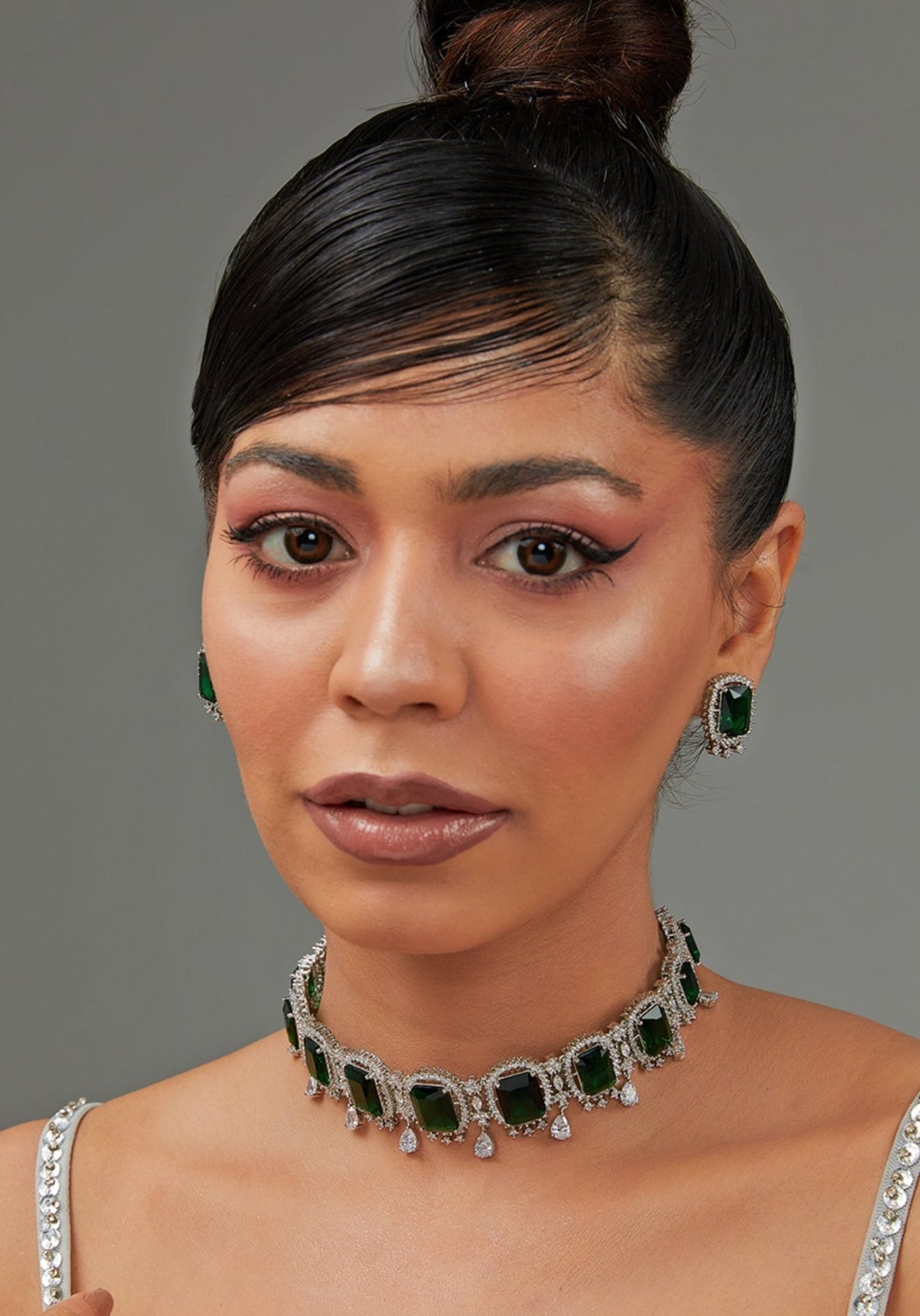Faux Diamond And Green Stones Choker Set Zevar by Geeta - Fabilicious Fashion