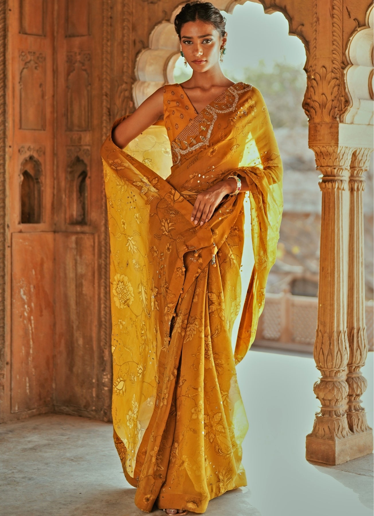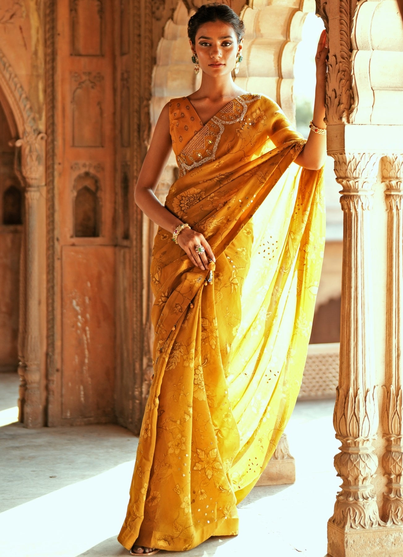 Add a touch of regal charm to your celebration wardrobe with our Gold Printed Organza And Embroidered Saree Set, a stunning fusion of tradition and contemporary elegance. This classic six-yard saree showcases a rich golden floral print, brought to life with exquisite zardozi, pitta, and mirror work that catches the light beautifully. It is paired with a luxurious Chanderi silk blouse that elevates the ensemble, along with a matching petticoat for added comfort and structure.