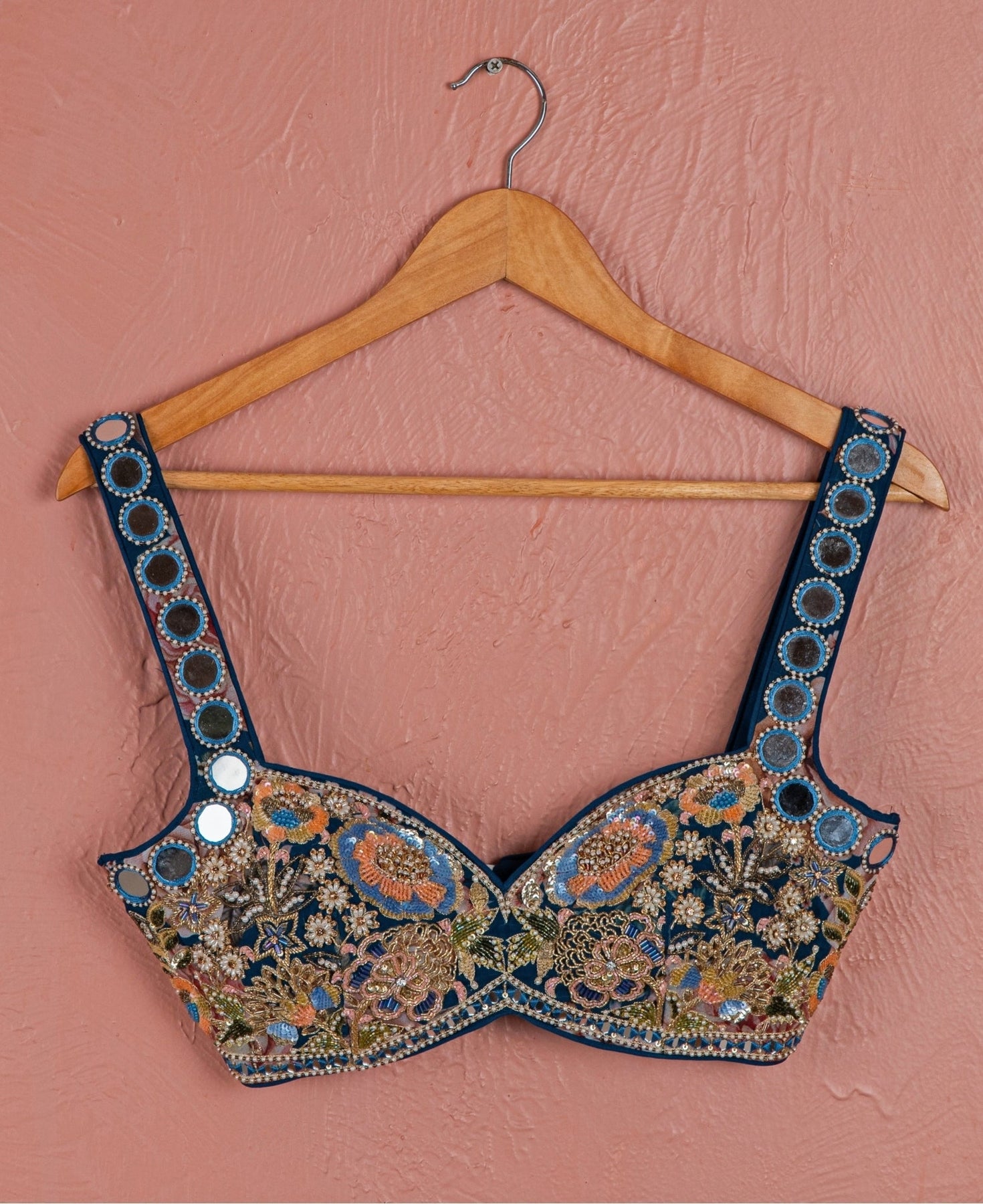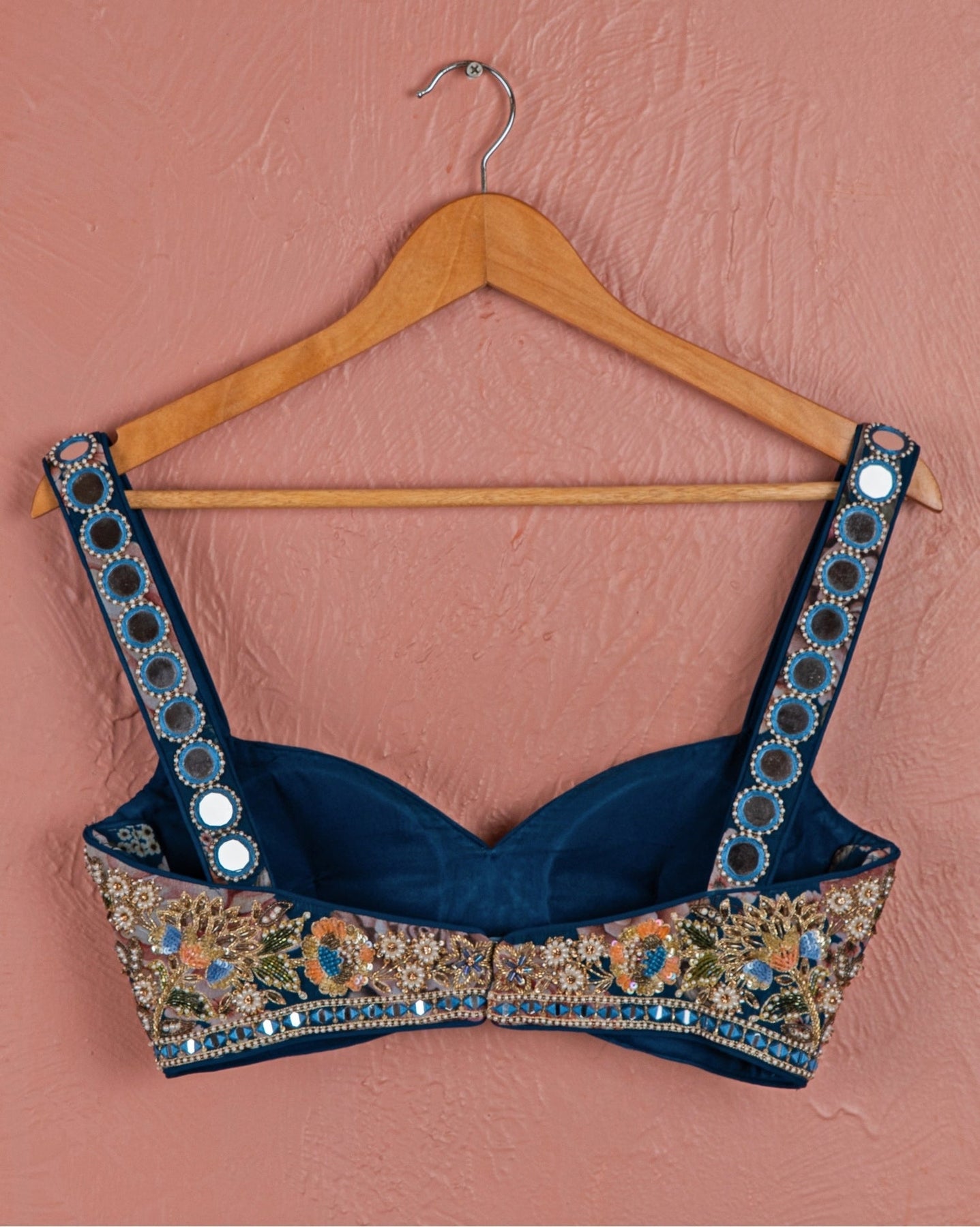 Celebrate in elegance with the Midnight Blue Floral Pre-draped Saree. The printed georgette saree flows beautifully, its soft sheen highlighted by intricate embroidery that catches the light with every move. Paired with a raw silk blouse enriched in sequins, mirror, zardosi, pearl, and zari embroidery, it exudes refined glamour and contemporary charm.