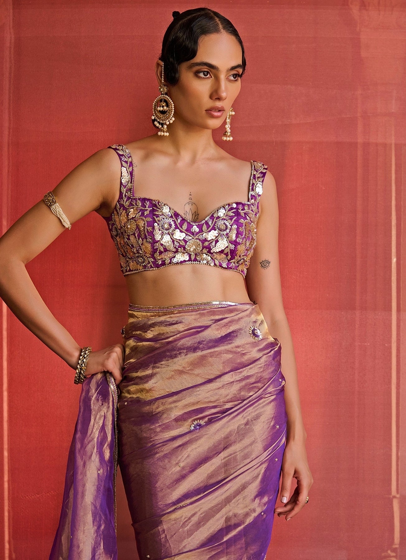 Capture effortless chic for every occasion in the Purple Silk Tissue Saree Set. The dual-tone silk tissue saree glows with a soft sheen, enhanced by delicate hand-embroidered borders and intricately scattered motifs that lend a touch of refined artistry. Paired with a satin blouse detailed in rich hand embroidery, it strikes the perfect balance between timeless elegance and modern charm.