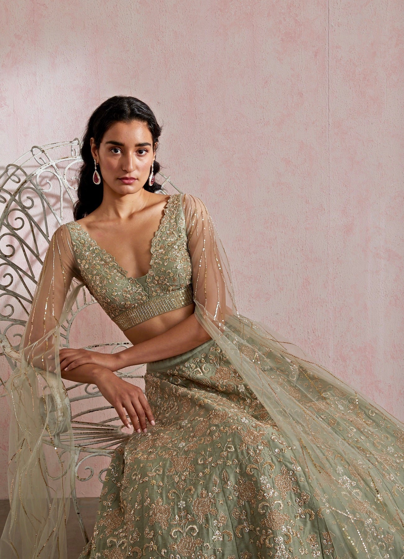 Let your bridal glow shine through in the Amayra Sage Green Bridal Lehenga. The raw silk lehenga features delicate rose motifs that lend beauty and depth to its serene sage hue. Its matching embroidered blouse, finished with stylish Grecian sleeves, adds modern refinement while honouring traditional craftsmanship. Elevated, graceful, and softly luminous, it is designed for a bride making her precious moment unforgettable.