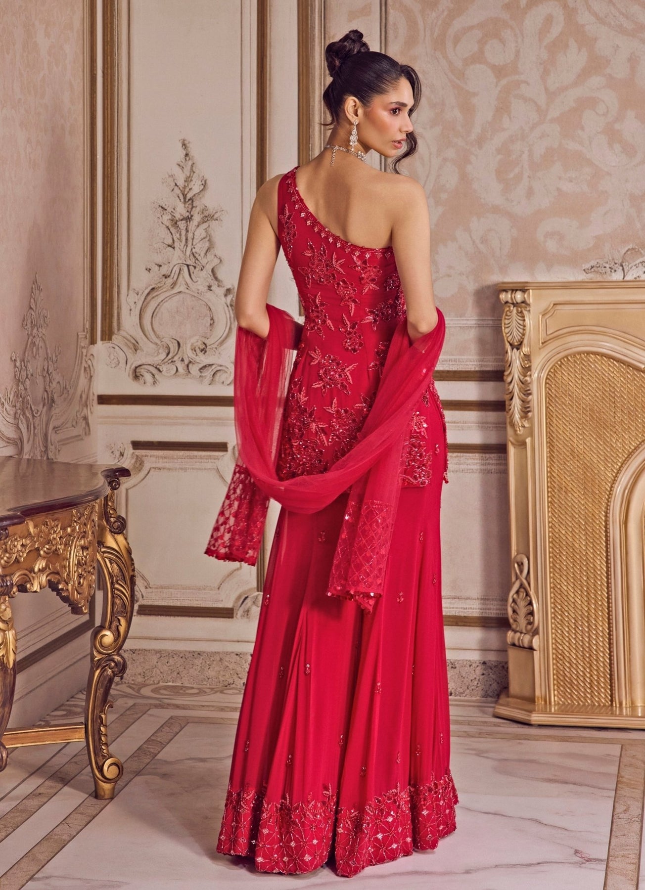 Mark the moment with refined dressing in the Hot Pink One Shoulder Kurta Pants Set. Crafted from lustrous georgette, the one-shoulder kurta stands out with tonal floral and geometric embroidery, accented by delicate beadwork and hand-made tassels that add a playful charm. The look is paired with kalidar pants featuring embroidered borders and a sheer net dupatta for an effortlessly elegant finish.