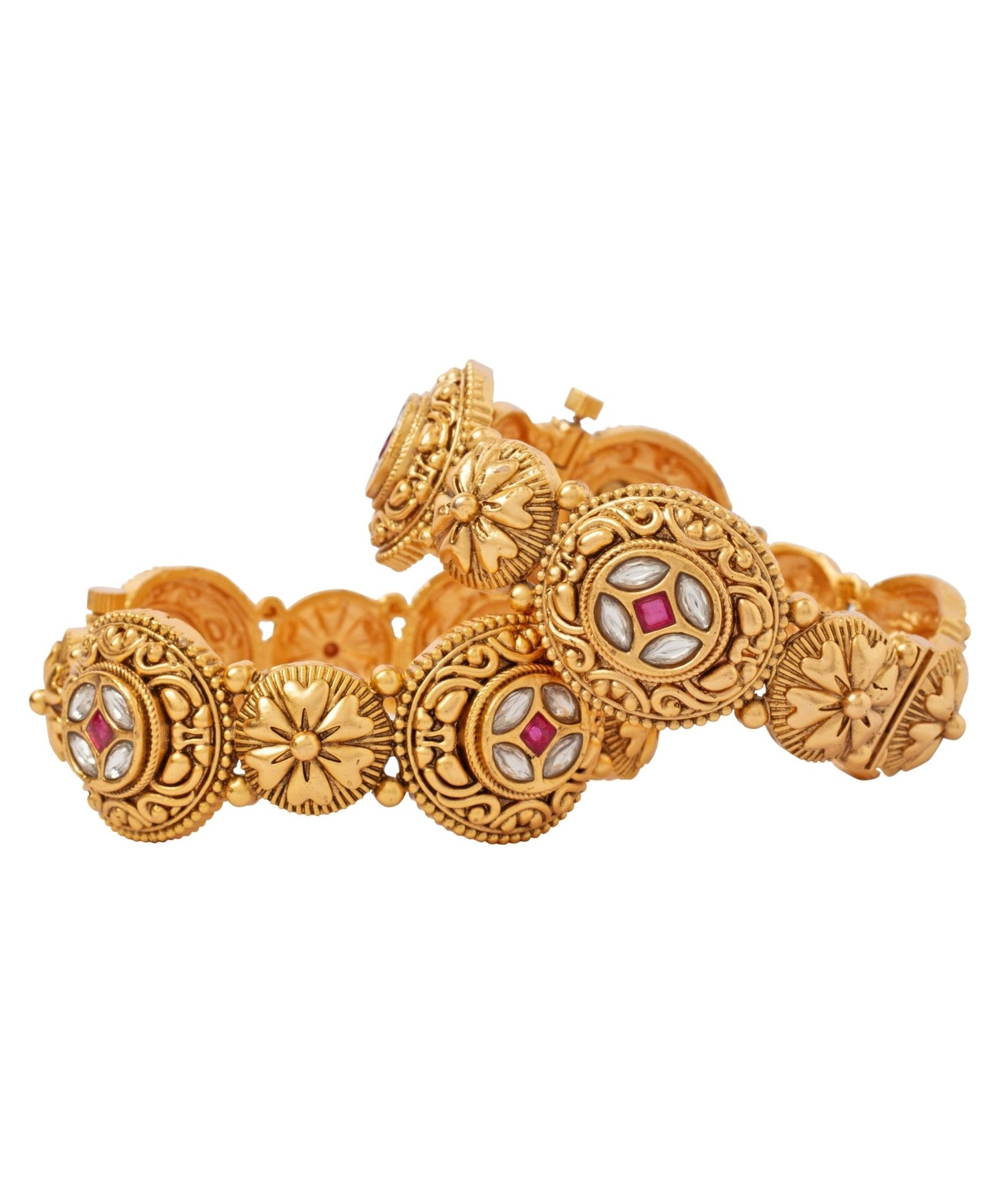 Gold-toned Kundan Polki bangles with intricate craftsmanship and ornate detailing, crafted for durability, long-lasting shine, and a premium feel. Adorned with embedded stones that heighten the regal and luxurious appeal, finished with high-quality materials for a refined look.