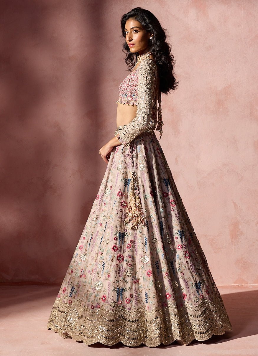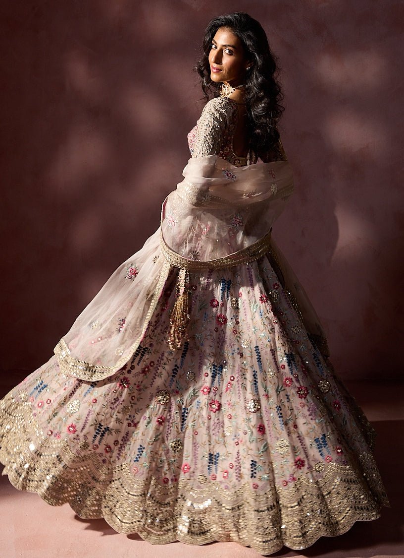 Glow with anticipation and style with this Dusty Pink Lehenga Set that showcases multicolour resham embroidery accented with applique and patra work. The blouse mirrors the artistry, while the dupatta adds gentle movement and polish. Ideal for joyful sangeet celebrations.