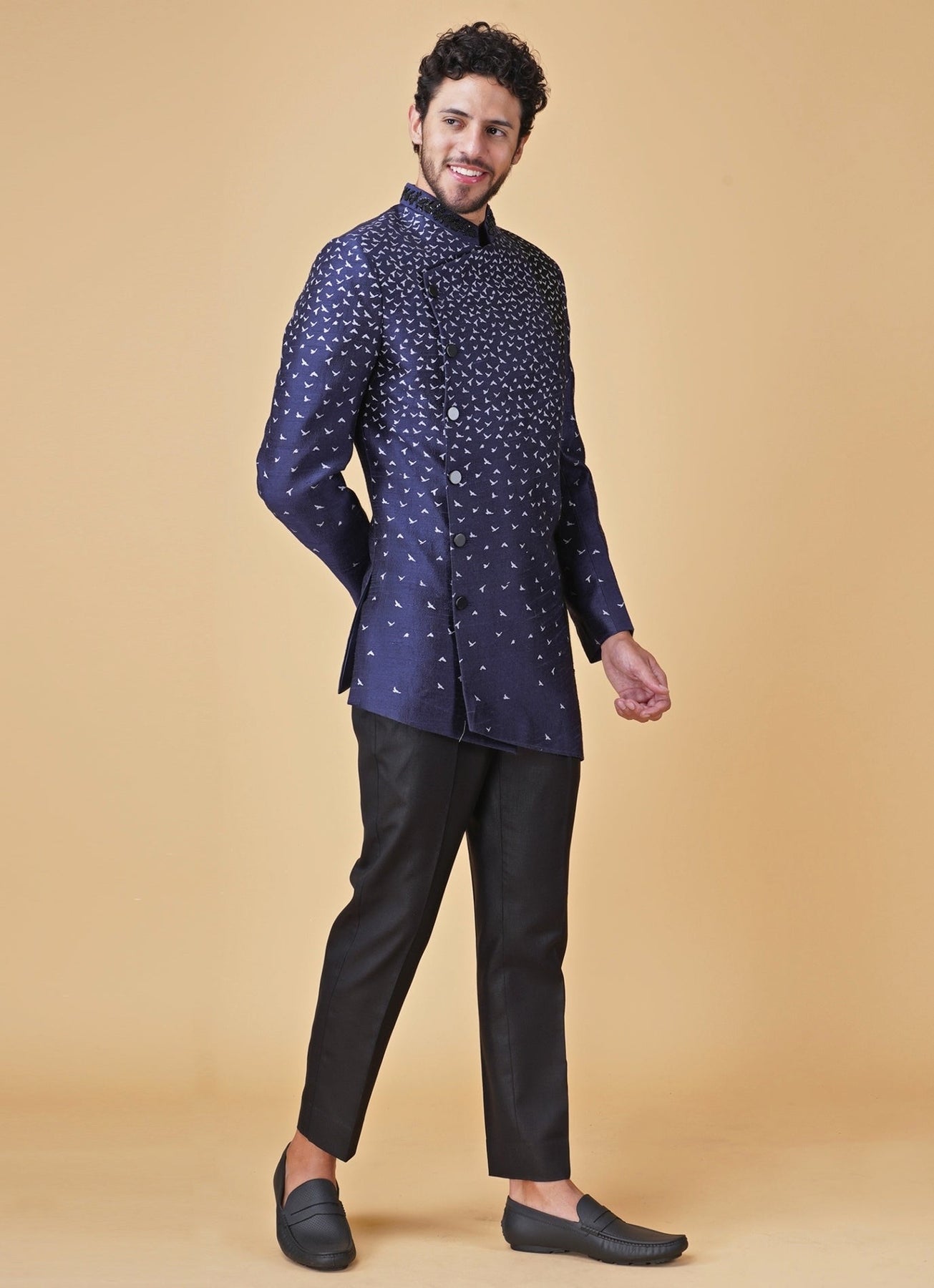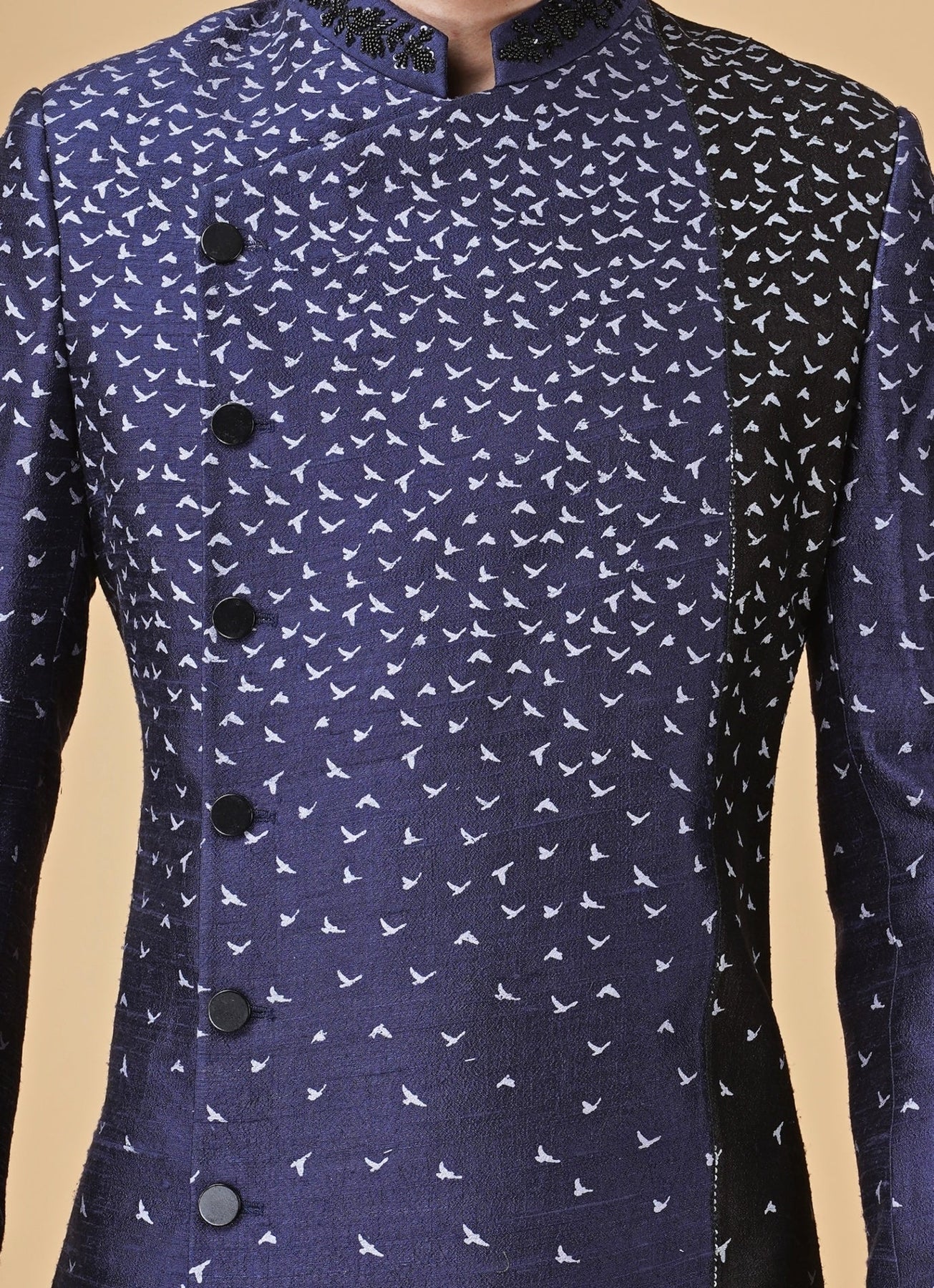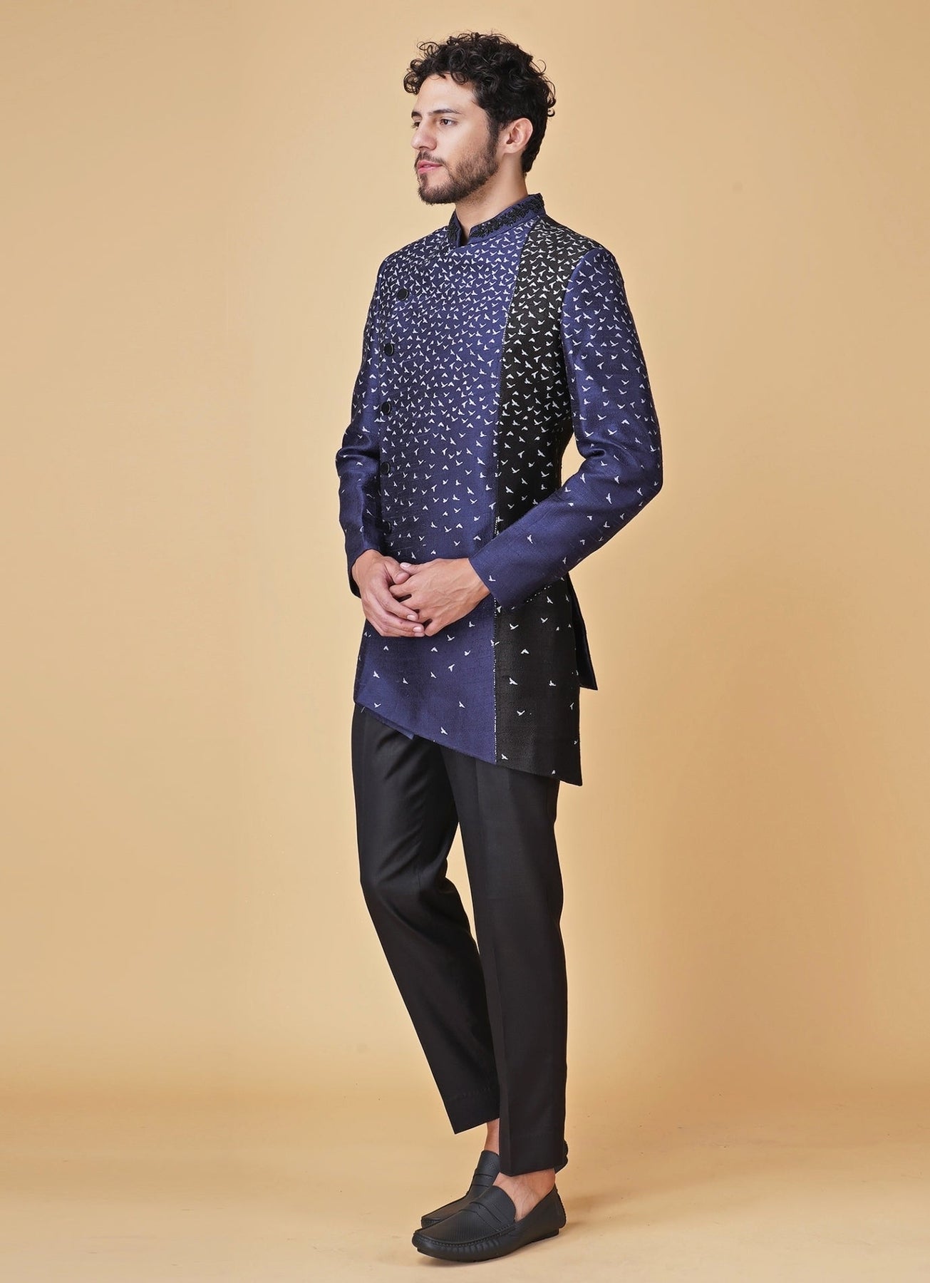 Elevate destination celebrations with a bold animal-print statement in Blue and Black Kurta with Long Jacket Set. The asymmetrical Indo-Western jacket is designed with placement printing that feels artful yet polished, creating instant impact for family events. Coordinated pants keep the look streamlined and easy to wear from sundown cocktails to dinner festivities. Add a minimal chain pin and classic loafers for a confident finish.