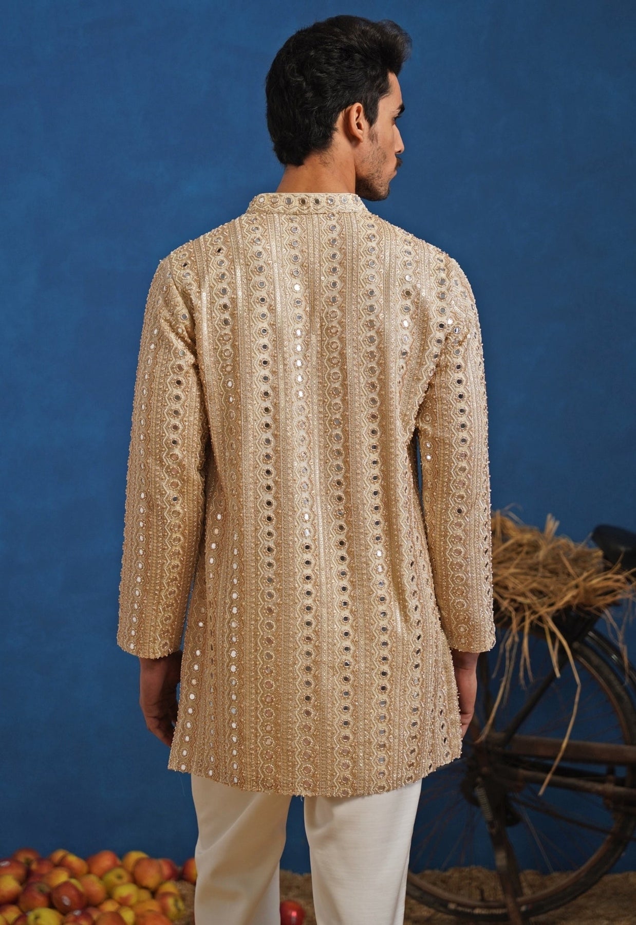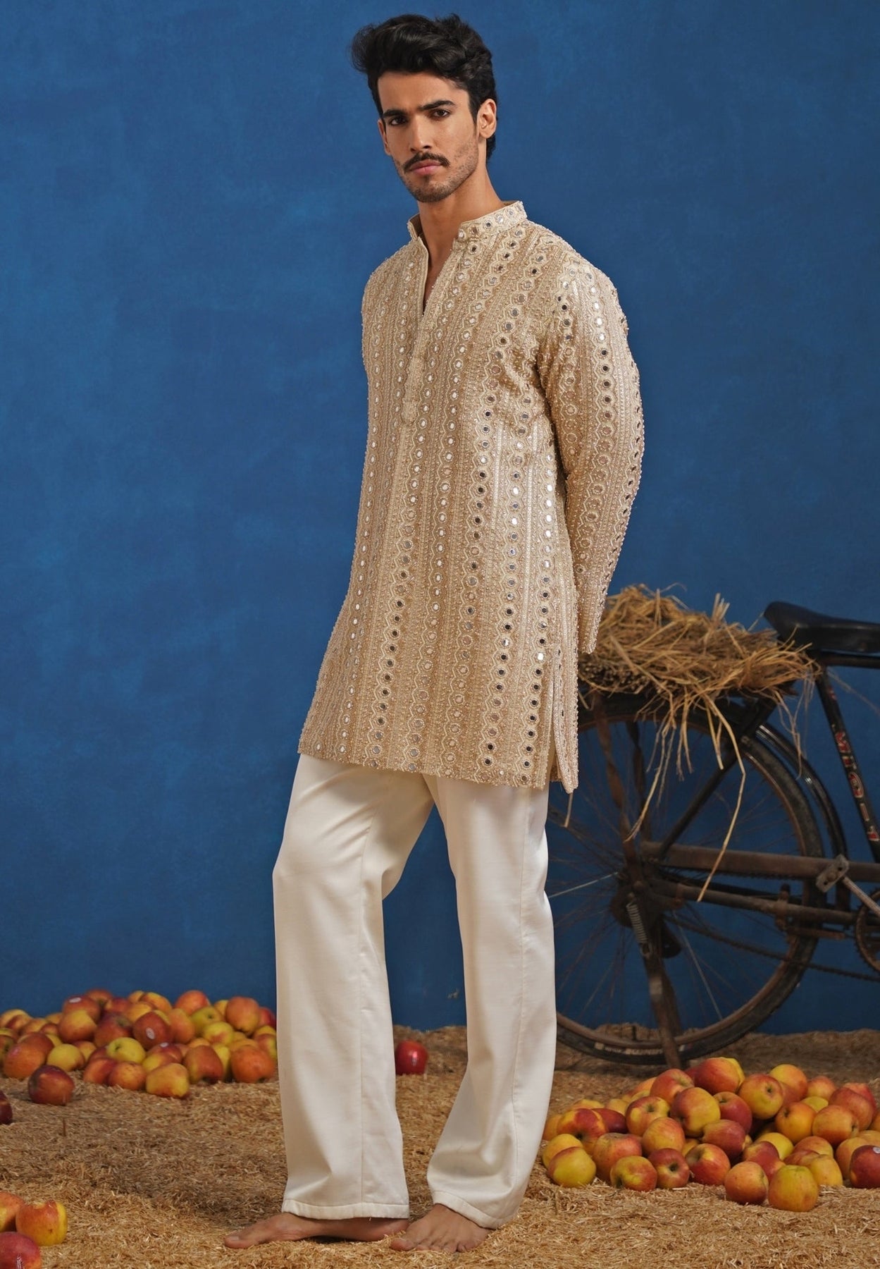 Set a radiant tone for roka and engagement moments in this Gold Short Kurta Set. Clean straight pants ground the look, while the georgette kurta features a band collar and full sleeves finished with mirror work and cutdana accents integrated into detailed thread embroidery. The symmetrical placement delivers a polished glow without excess, making it ideal for intimate celebrations and festive dinners.