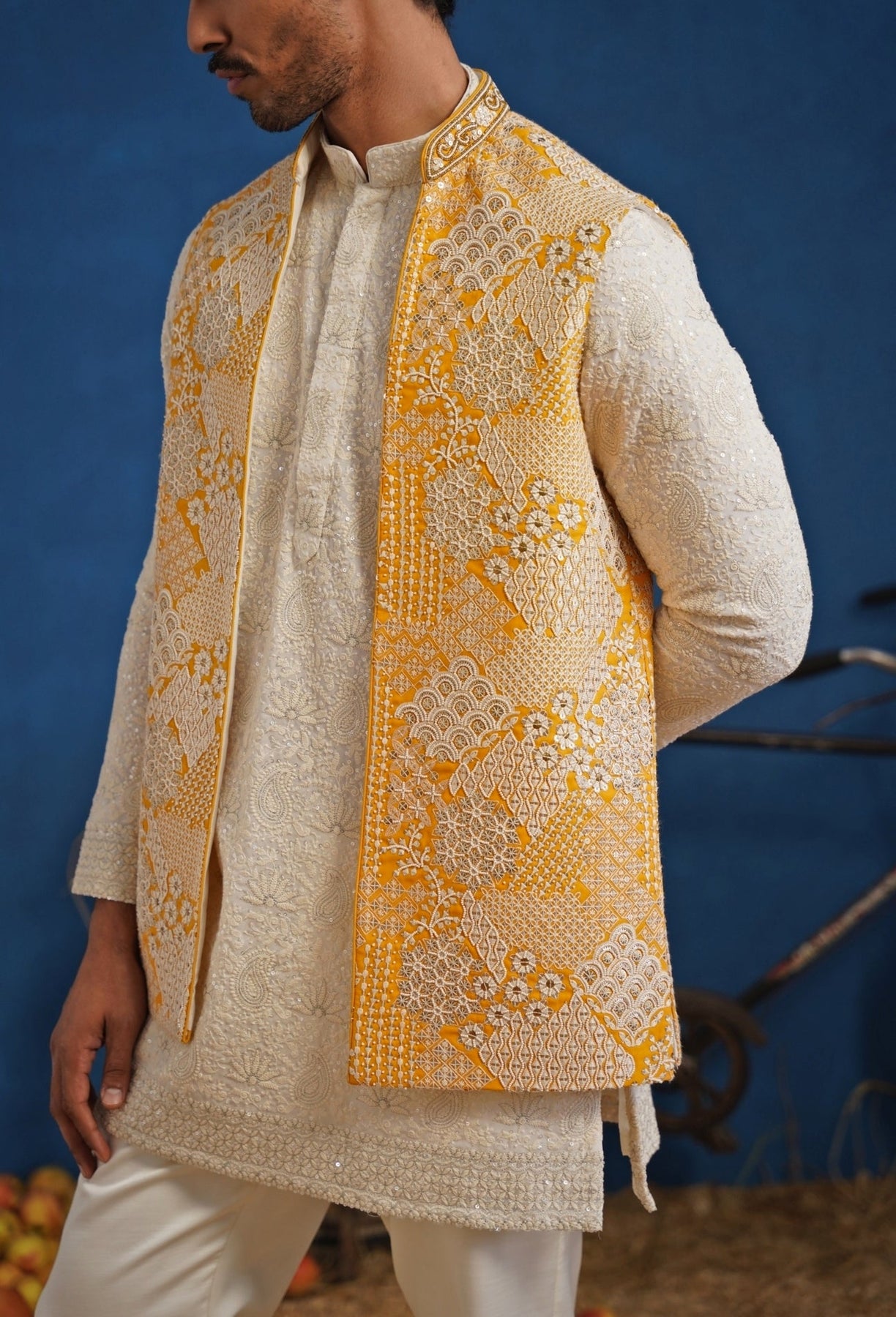 Turn up the haldi energy with this ivory and Yellow Short Kurta Jacket Set designed for joyful family celebrations. The georgette kurta carries fine all-over detailing for gentle texture, paired with straight pants that keep the look clean. The sleeveless jacket is elevated with geometric and floral-inspired embroidery, punctuated by delicate mirror work for a fresh glint under daylight. Add classic juttis and a bright stole to lean into the ceremony’s playful mood.