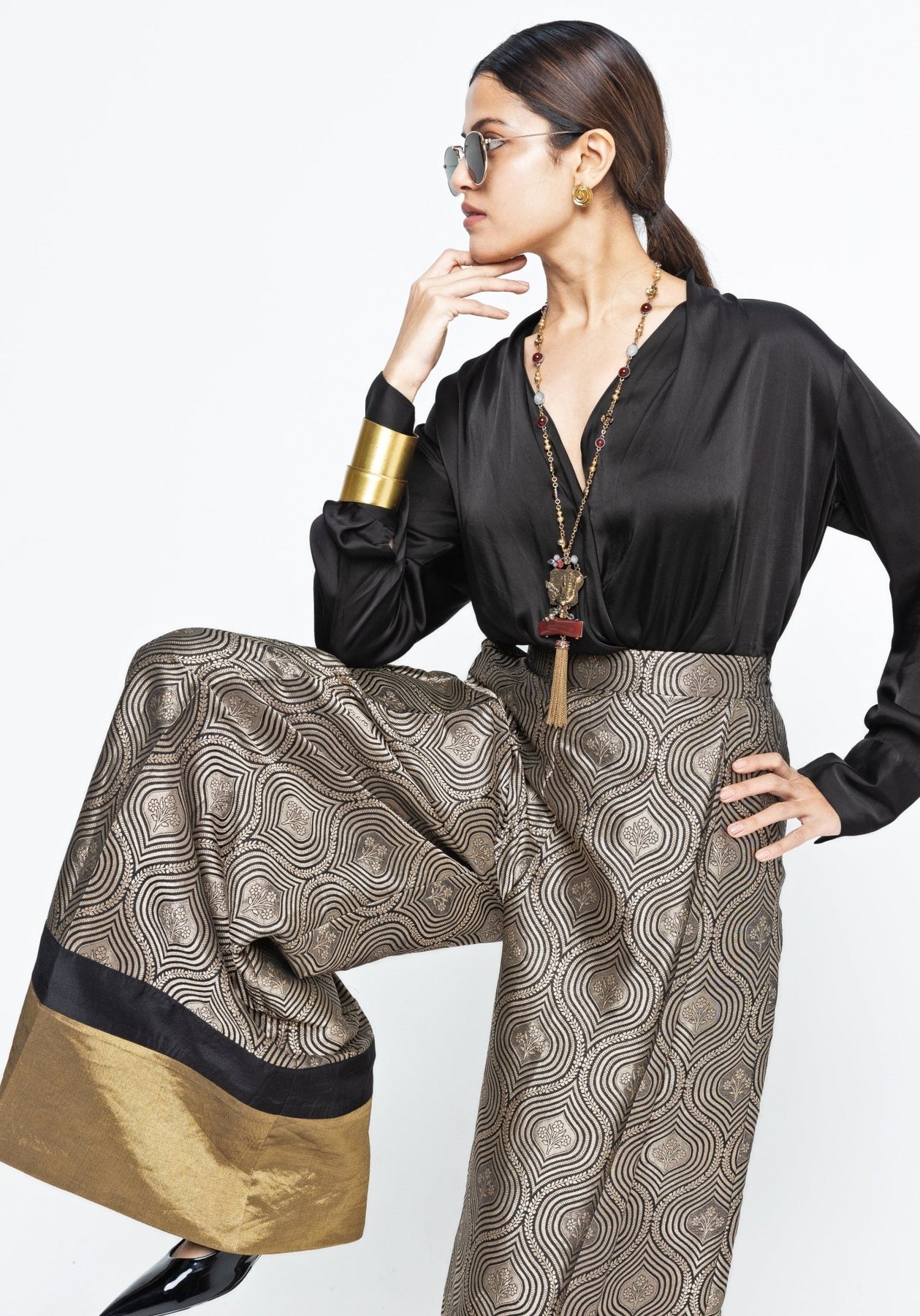 Black Wrap Shirt With Brocade Silk Pants Sobariko - Fabilicious Fashion