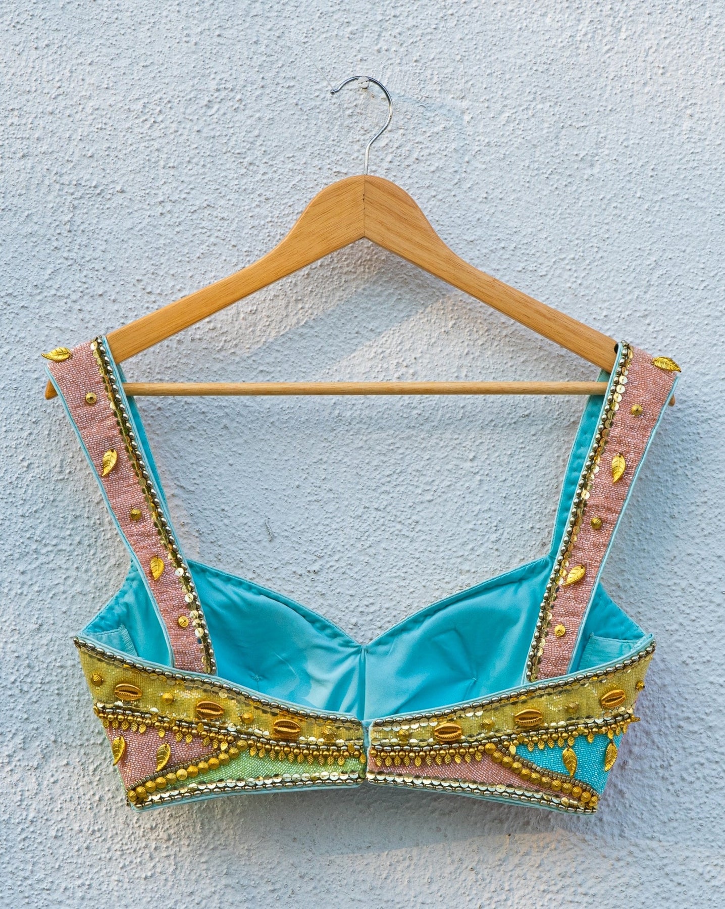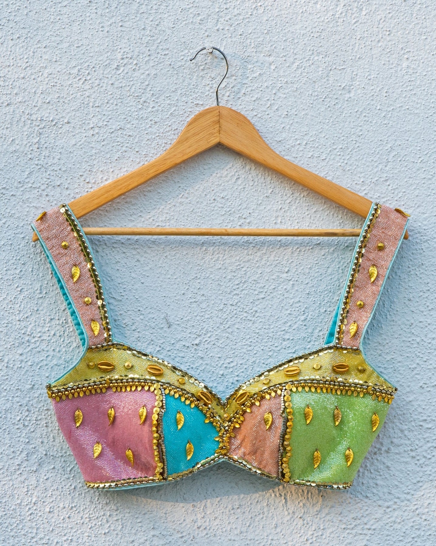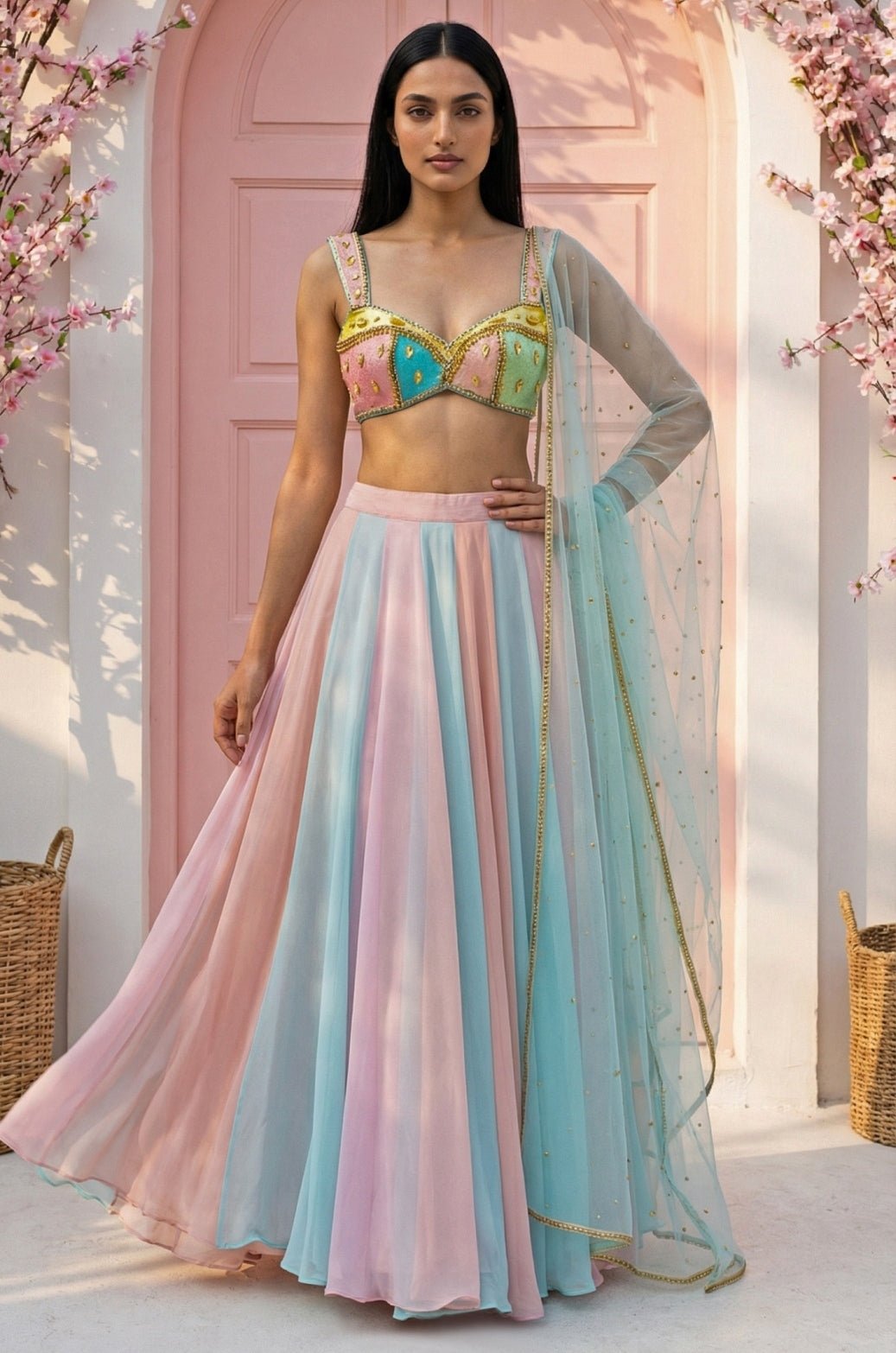 Embrace vibrant style at your next celebration in this Multicolour Lehenga Set that brings festive energy with elevated craftsmanship. The airy georgette lehenga paired beautifully with multicolour blouse enhanced with cutdana, beadwork, and gold detailing, for a striking coordinated look. Finished with a soft net dupatta in blue, it’s ideal lehenga for destination weddings, cocktail evenings, and wedding-weekend celebrations where you want to stand out.