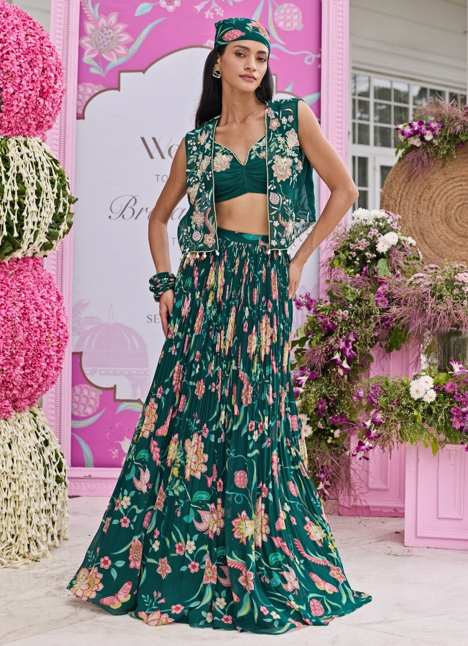 Bring playful glamour to every event in this Green Georgette Skirt Set that moves with captivating ease. The printed skirt sways gracefully, while the intricately embroidered blouse adds opulent charm. A chic short jacket completes the look with a refined festive statement.