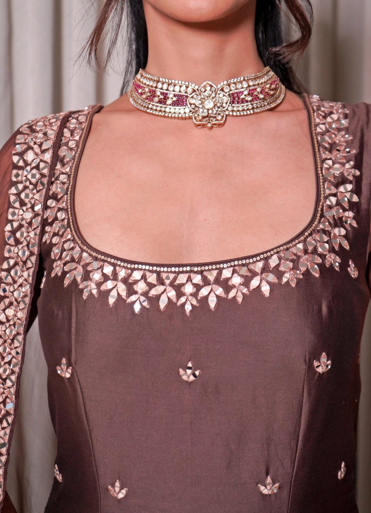 Brown Mirror Embroidered Chanderi Kurta Pants Set