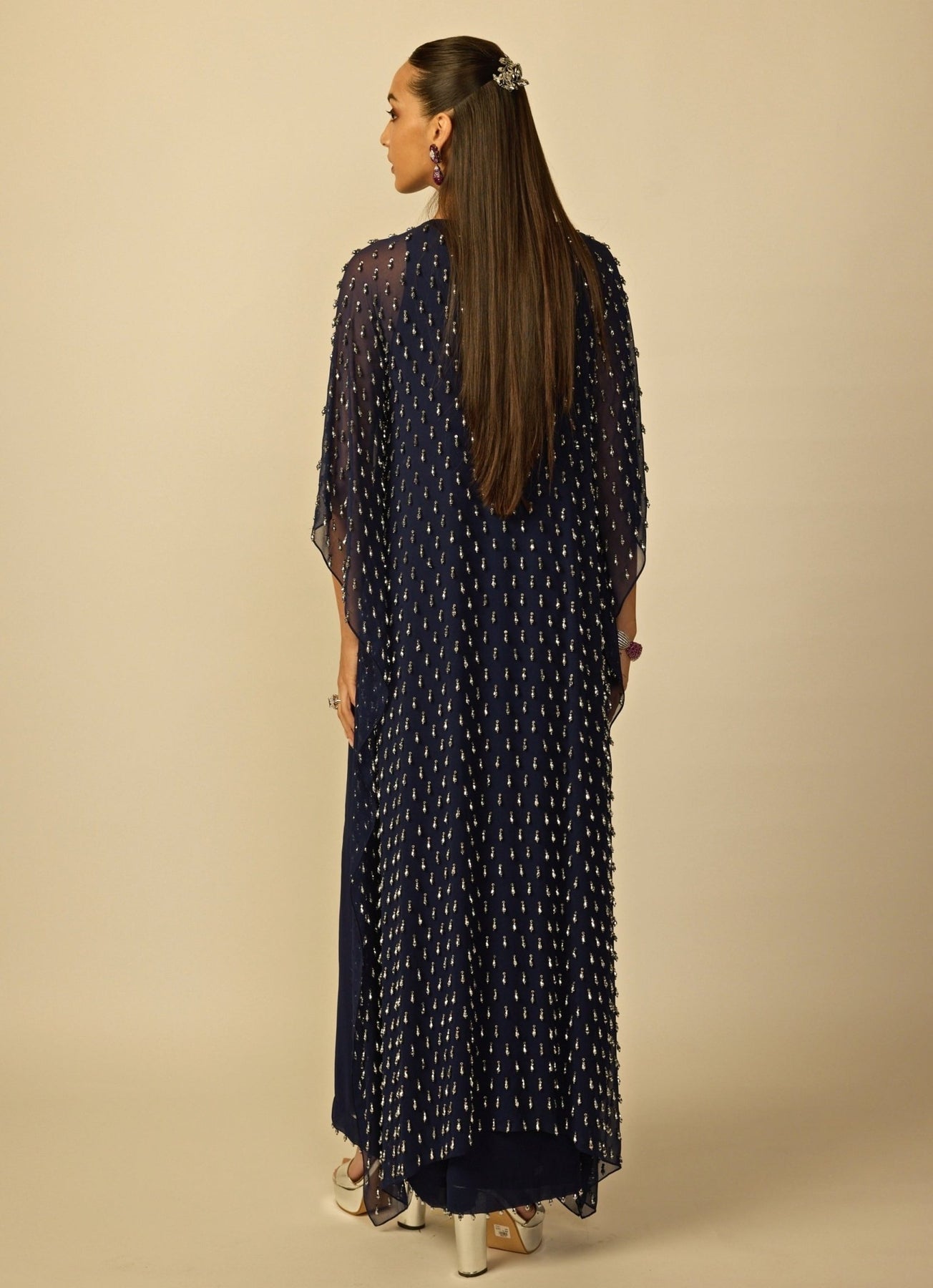 Radiate joy and sophistication in the Deep Blue Kaftan Set designed for destination celebrations. The kaftan top moves with airy ease, finished with silver drop embroidery that flashes softly under evening lights. Matching georgette pants keep the look sleek and comfortable, perfect for long ceremonies and seaside dinners. Style with metallic heels and statement earrings for a polished, resort-ready finish.