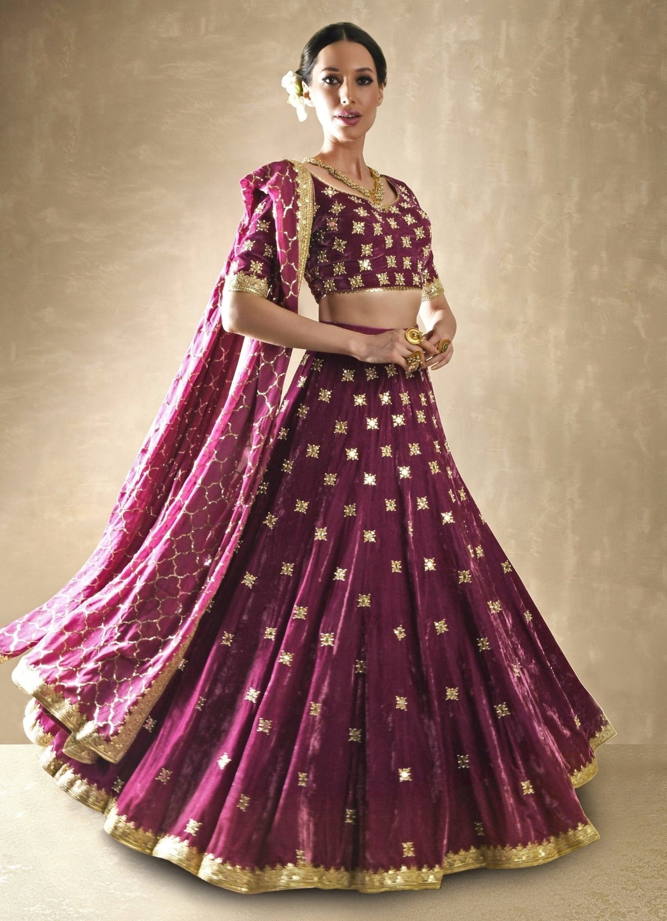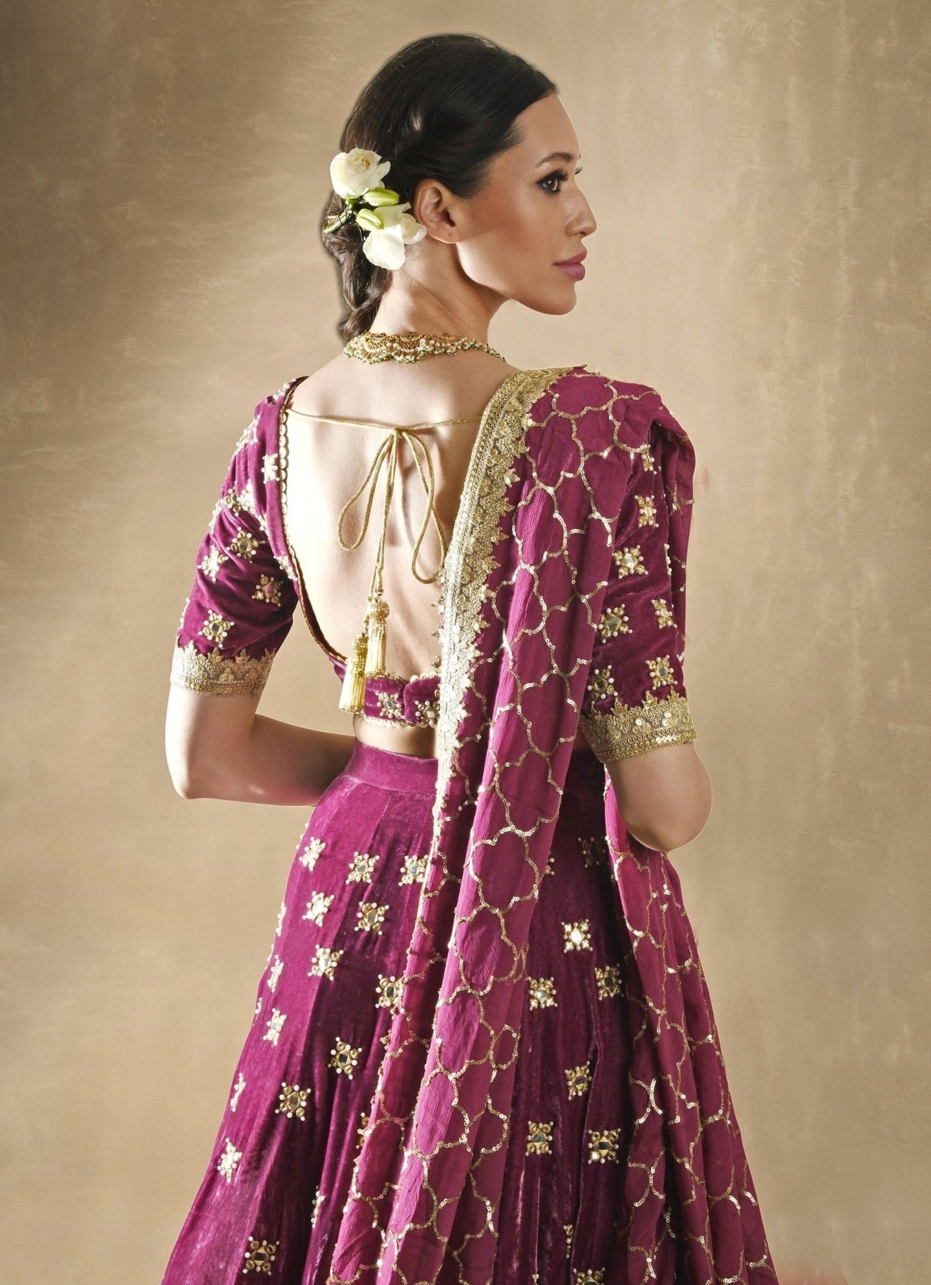 Make a statement at your next event with this exquisite Purple Pink Embroidered Panelled Lehenga Set, radiating elegance and traditional charm. Made from velvet fabric, the purple pink lehenga is adorned with intricate mirror and pearl buttis scattered across the rich material, creating a captivating shimmer, while the hem features a stunning cutwork border in gold for a touch of regal splendor. Paired with a coordinating blouse, this look exudes sophistication. Completed with a heavy chiffon dupatta drapes beautifully, embellished with a shimmering sequin jaal pattern and a luxurious gold border, enhancing the overall grace. Designed for both style and convenience, the lehenga comes with built-in cancan for added volume and hidden pockets for practicality. Perfect for Sangeet ceremonies, weddings, or festive celebrations, this outfit promises to make you feel unforgettable.