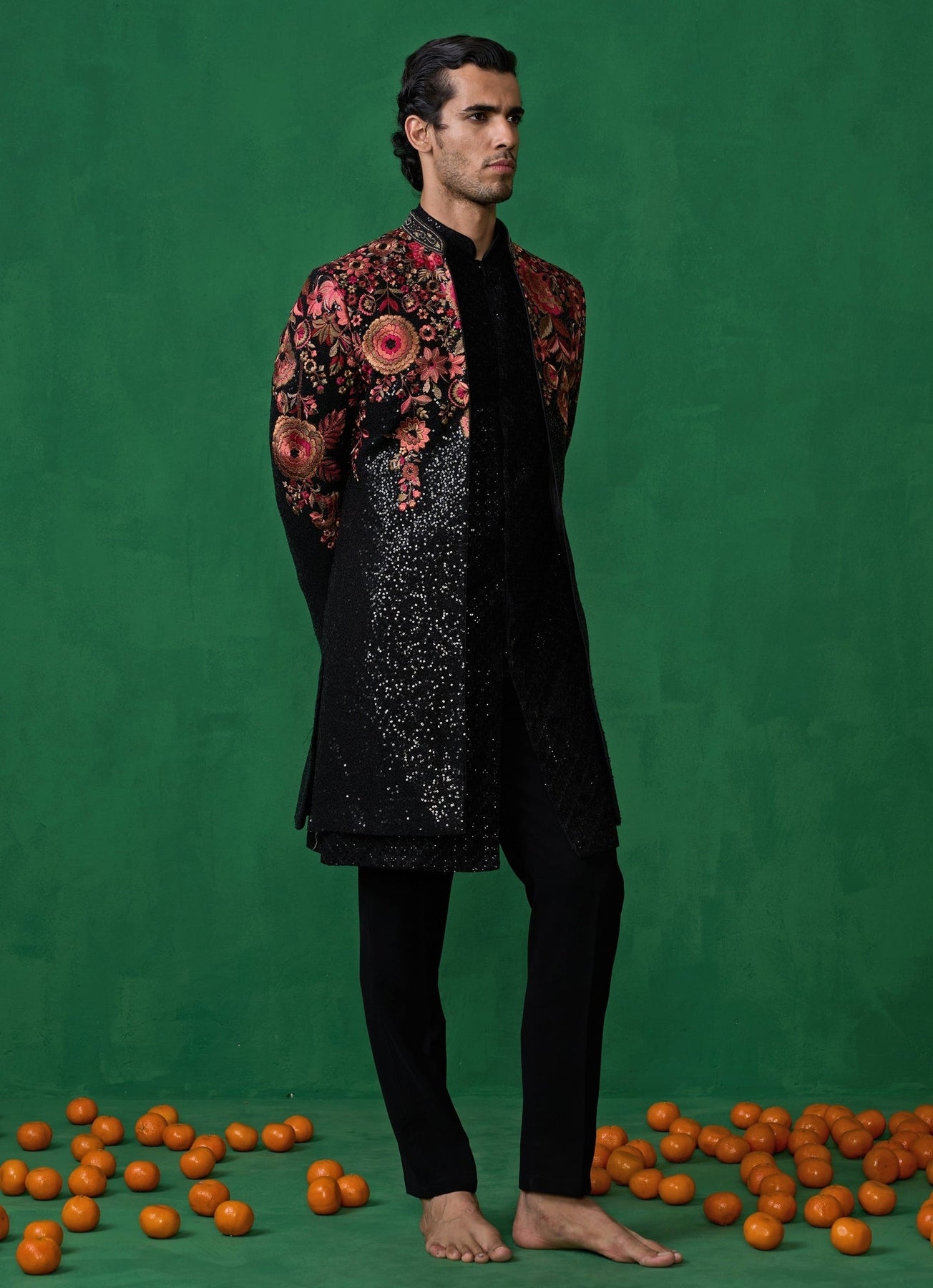 Exude sophistication in this black floral embroidered georgette long jacket kurta set, a perfect balance of artistry and elegance. The ensemble features a straight-cut kurta paired with slim trousers, layered with a beautifully embroidered jacket. The jacket showcases intricate detailing with floral and nature-inspired motifs that add depth and refinement. The understated kurta beneath allows the richly embroidered jacket to take center stage, creating a look that’s both timeless and modern.