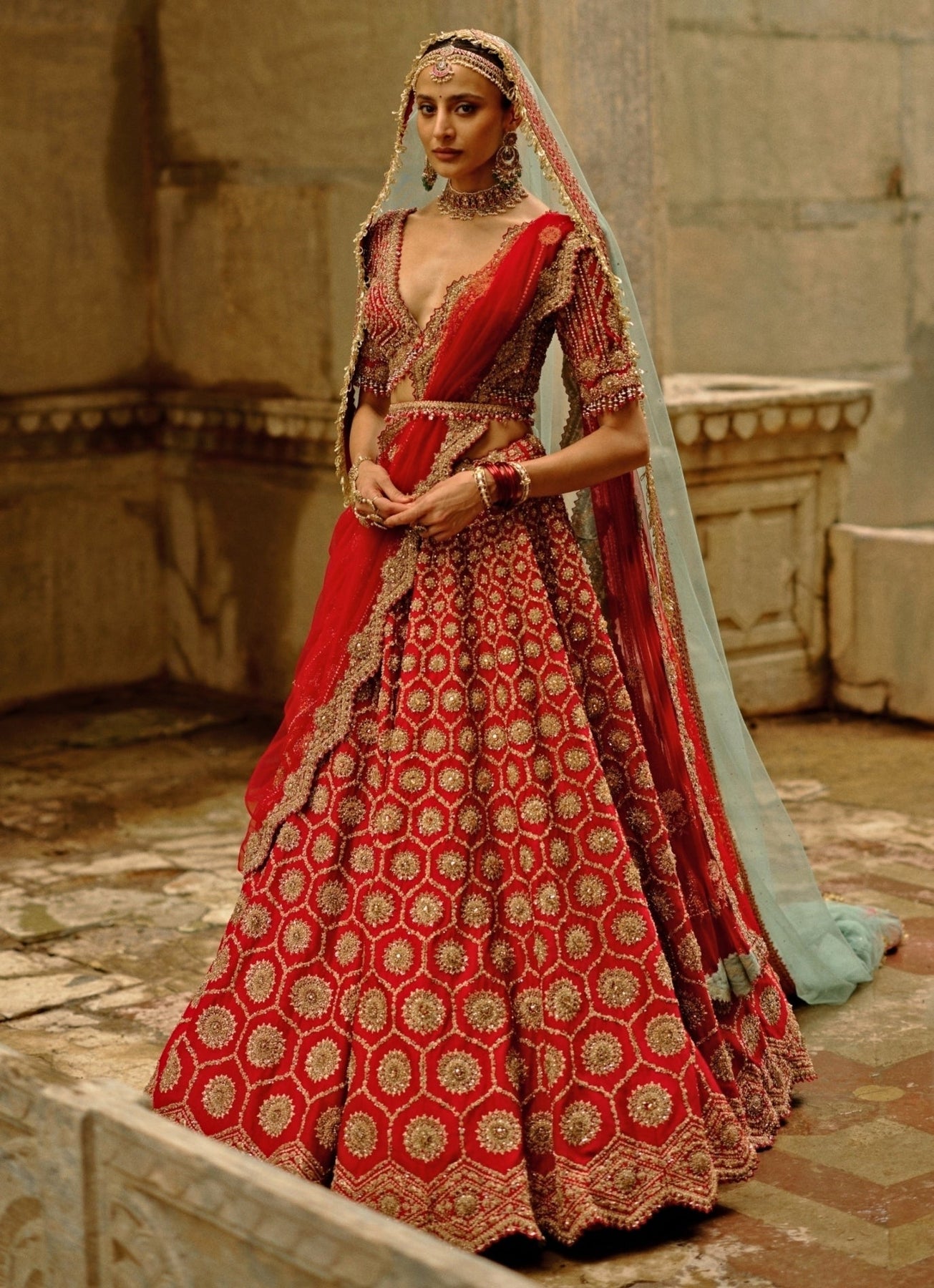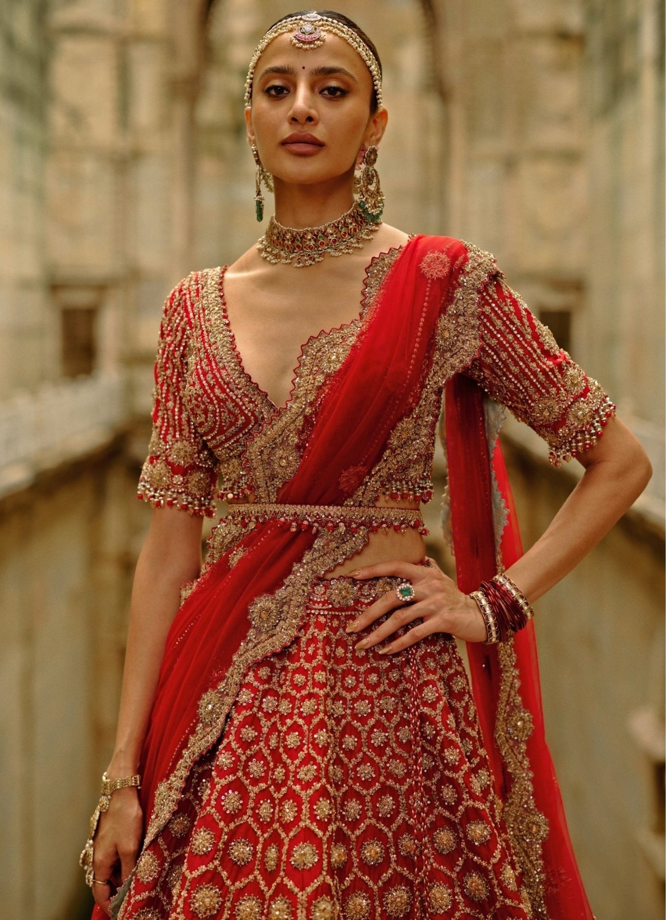 Capture the essence of your dream wedding in the Red Lehenga Set that celebrates timeless bridal tradition. The lehenga features rich crystal accents, zari, dabka work, and zardozi embroidery, creating depth and opulence across the fabric, while the blouse complements the detailing flawlessly. Finished with a matching dupatta, this look is made for unforgettable wedding moments. Pair it with an optional veil for more rich look.