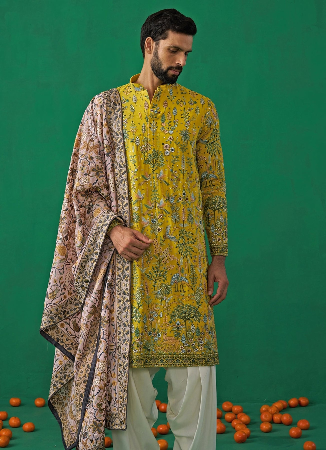 Mark the moment with the radiant charm of the Yellow Embroidered Georgette Kurta Set, crafted to capture the spirit of joyful celebrations. The long, straight-cut kurta is adorned with intricate floral and bird-inspired embroidery and is paired with patiyala-style bottoms for fluid comfort. A contrasting dupatta richly detailed with ornate embroidered borders completes the look.
